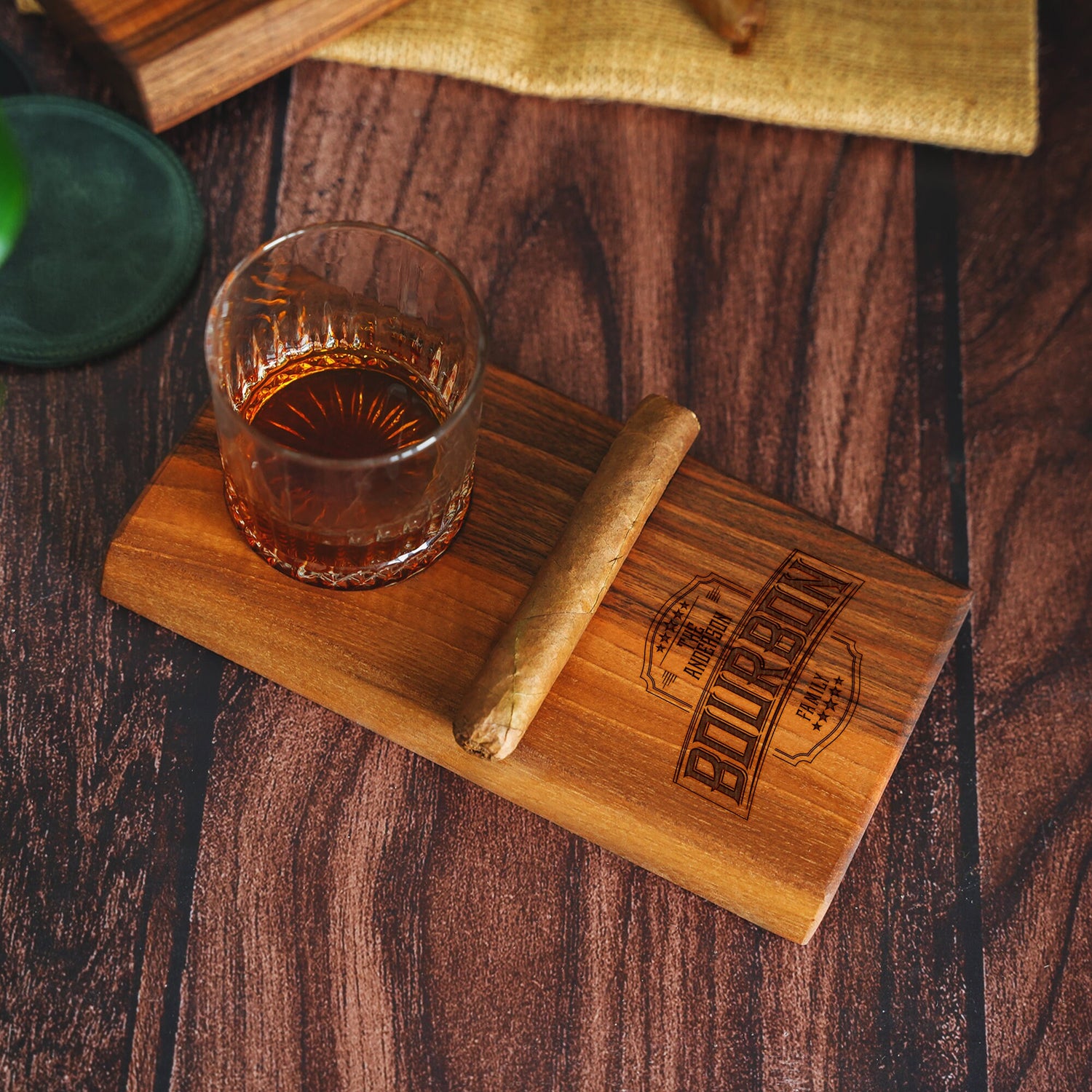 Seeking a gift that embodies luxury and celebrates a couple's shared passions? Look no further than this exquisite personalized cigar and whiskey set. This carefully curated collection, featuring a handcrafted wooden cigar holder, matching ashtray, and two elegant whiskey glasses, is designed to elevate those special moments shared between two people who appreciate the finer things in life.