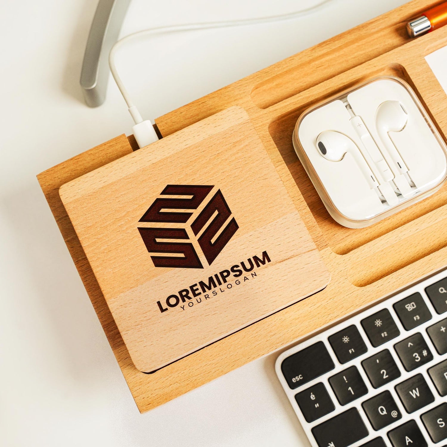 Personalized Office Desktop Organizer, Wooden Engraved Laptop Stand, Custom Logo Business Gift, Phone Charging Station, Wood Desk Trays