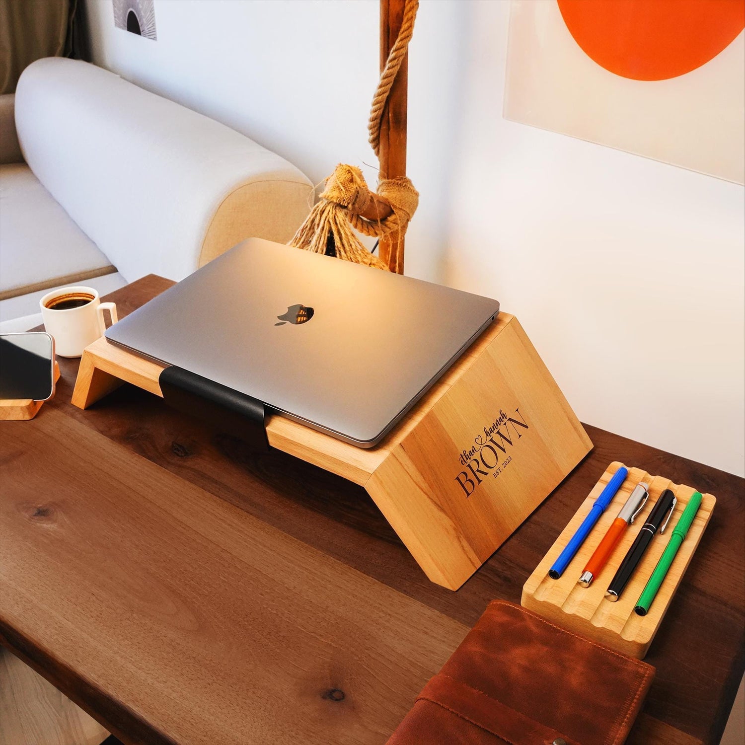 Personalized Wood Laptop Stand for Desk, Fountain Pen Holder, Custom Monogrammed Desk Organizer Set, Desk Decor, Wooden Trays, Gift for Him
