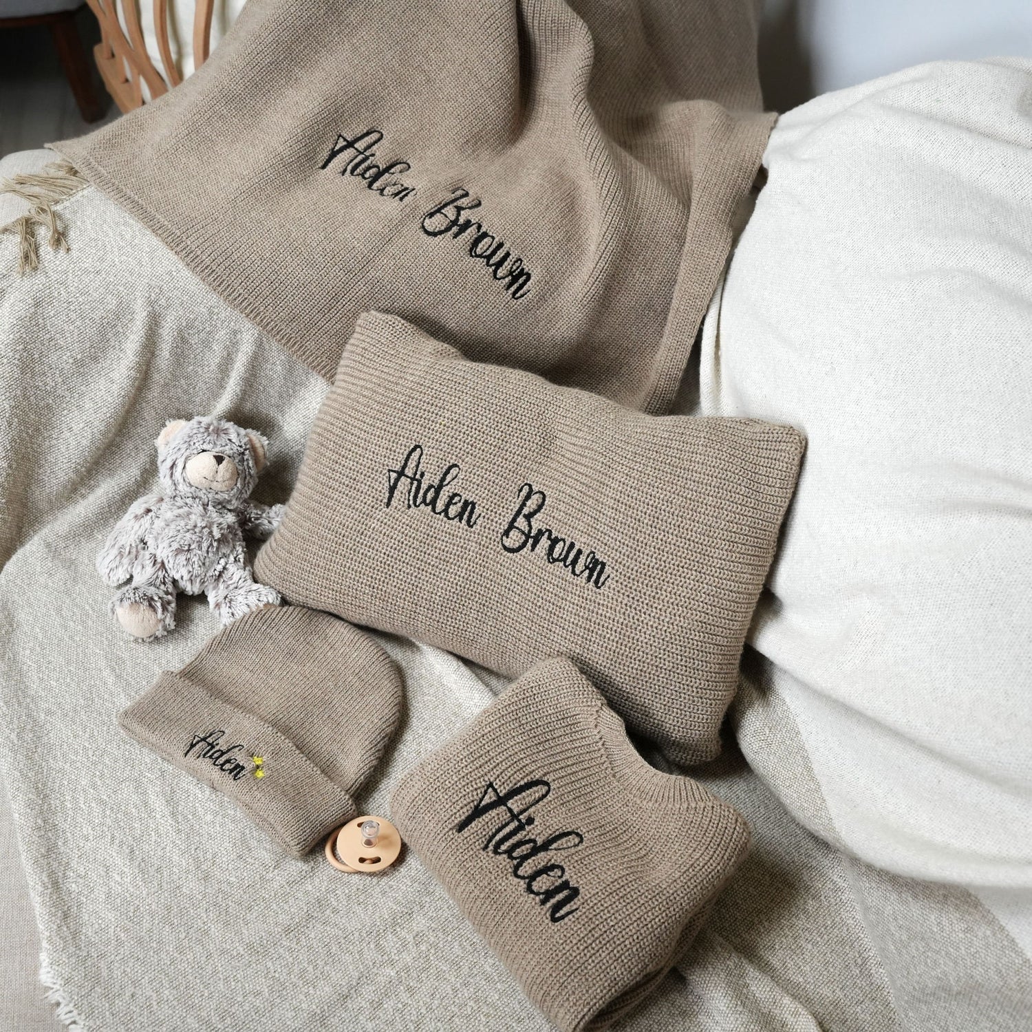 Celebrate precious milestones with this charming custom-knitted baby gift set! This heartwarming ensemble includes a cozy sweater, beanie, blanket, and pillow, all delicately hand-knitted with love. Perfect for marking the joy of a first Christmas, welcoming a newborn, or gifting a special treat at a baby shower, this set is crafted for unforgettable moments.