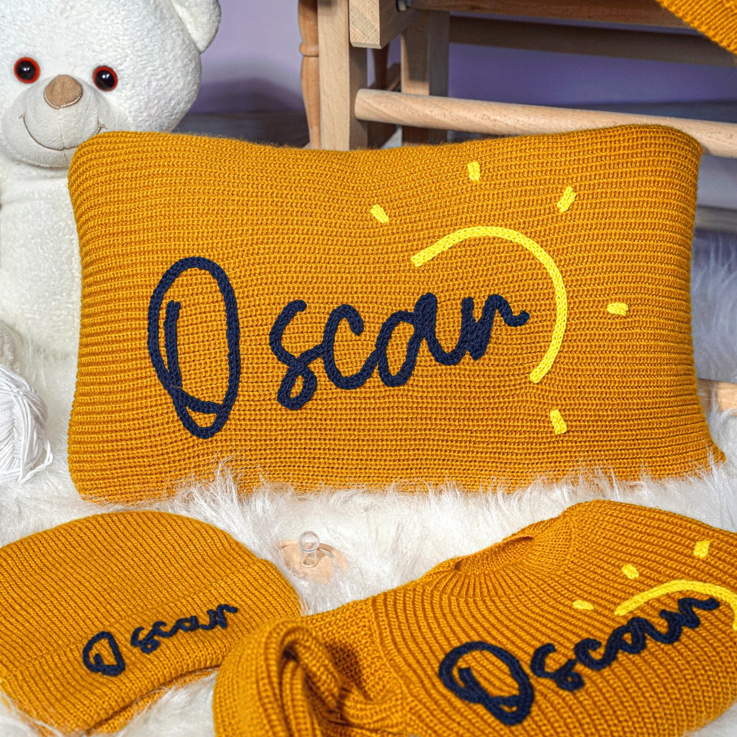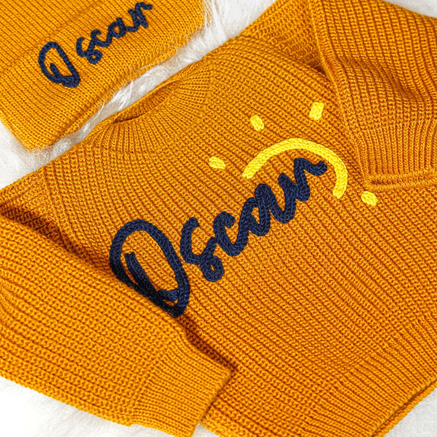 Hand-Embroidered with Heart: Each piece is meticulously crafted using the finest cotton knit, ensuring a soft and cozy feel against your baby's delicate skin. The personalization is achieved through beautiful embroidery, adding a touch of intricate detail and making this set truly unique.