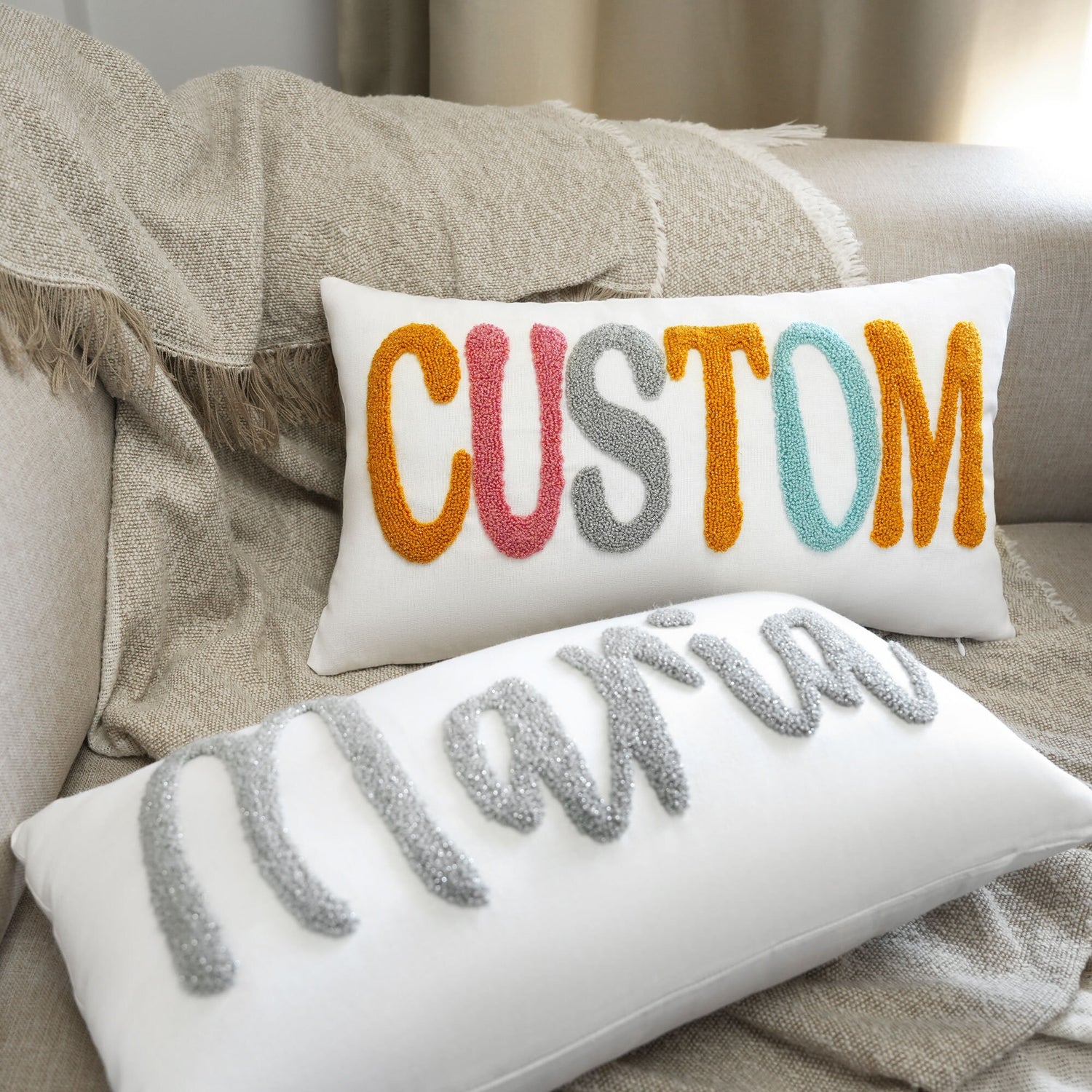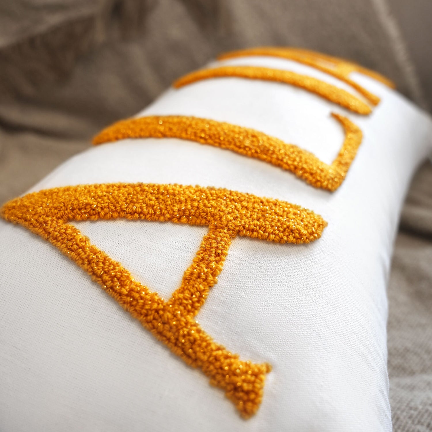 Golden Embroidered Punch Needle Pillow, Handmade Gift, Kid Room Home Decor, Custom Name Pillow Cover, Personalized Baby Gift Nursery Decor