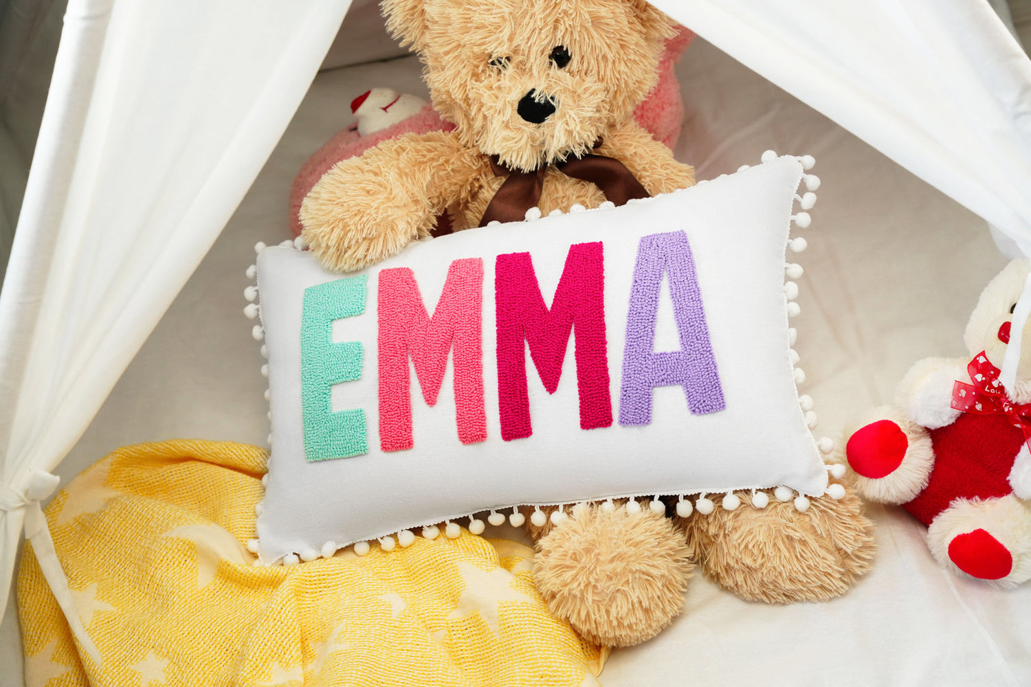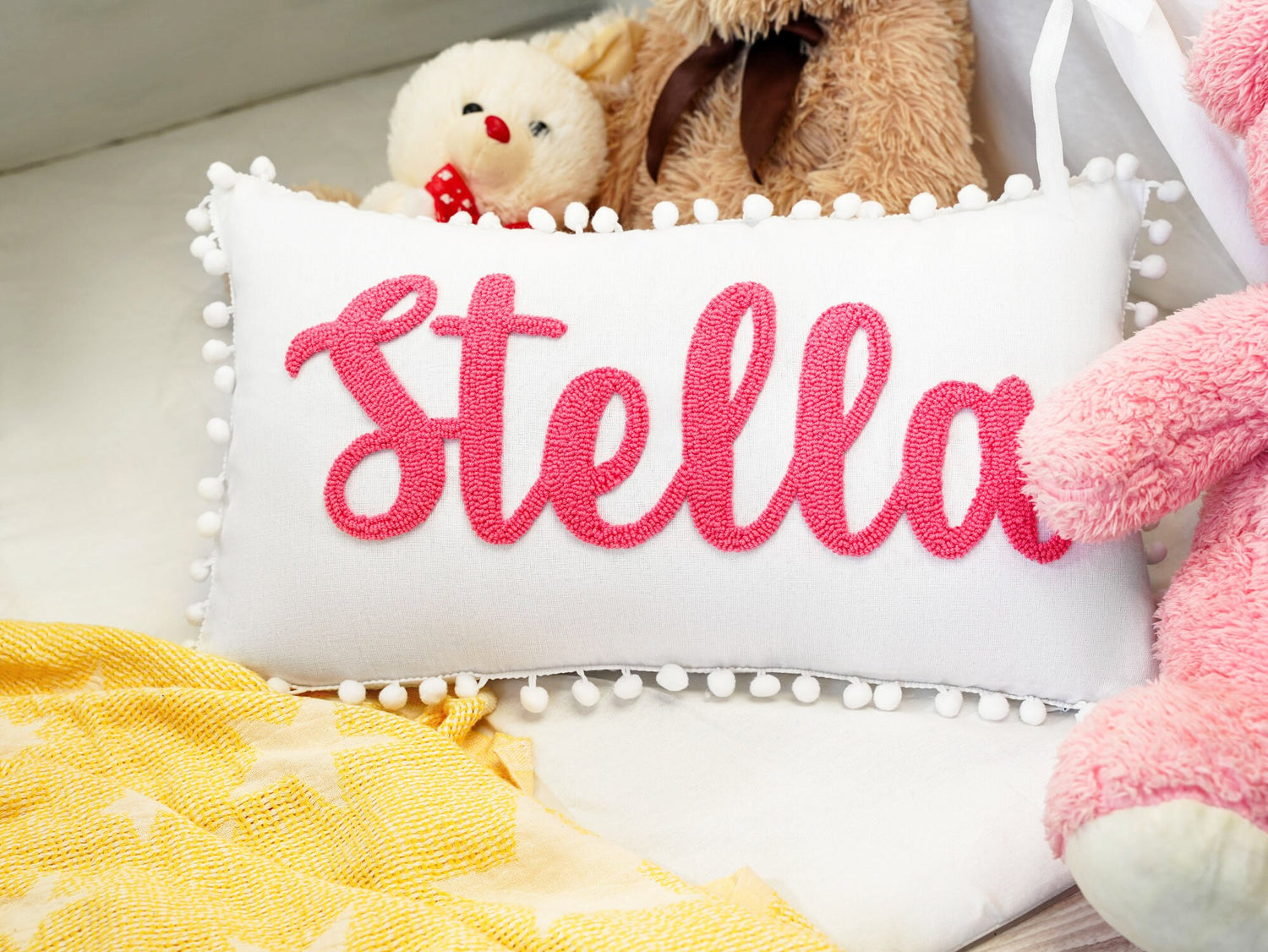 Personalize Name Embroidered Pillow, Custom Pom Pom Trip Punch Needle Nursery Decor, Dorm Room Decor, Kid Bedroom Decor, Christmas Gift Idea