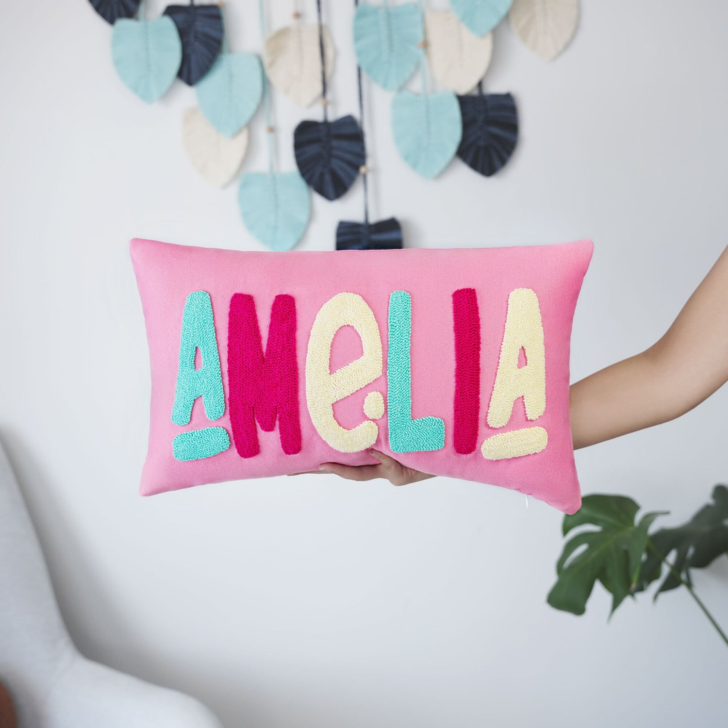 Welcome a new baby boy or celebrate a special graduate with this adorable personalized name pillow. Handcrafted with meticulous punch needle embroidery, this pillow is a perfect addition to a nursery, a dorm room, or a child's bedroom.