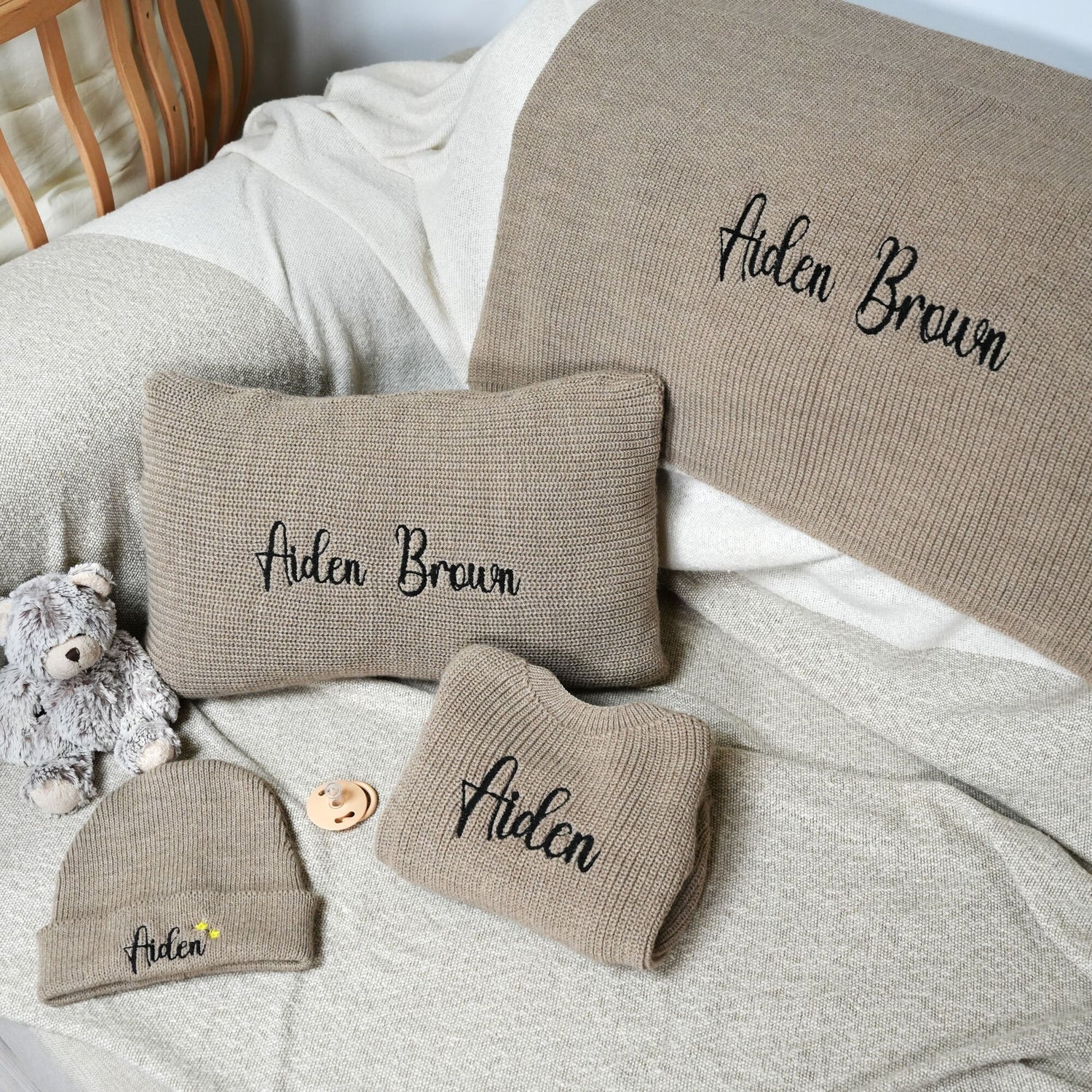 Celebrate the arrival of a new little one with a gift as special as they are: a handmade, personalized knitted baby gift set. This adorable set includes a cozy sweater, beanie, blanket, and pillow, all carefully crafted with love and the softest organic cotton.