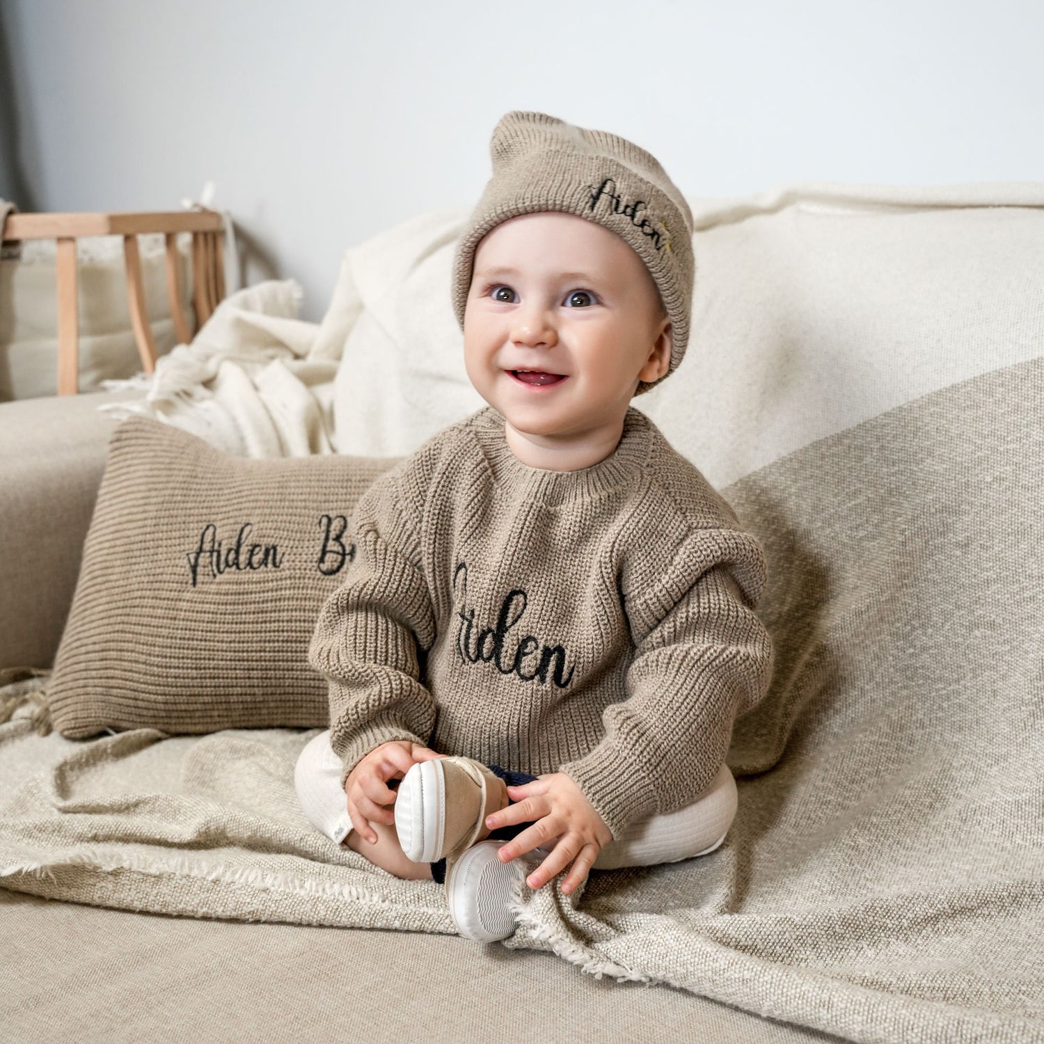 Personalized Baby Name Embroidered Sweater, Baby Shower Gift, Newborn Gift, Custom Baby Christmas Gift Set, Knitted Sweater, Blanket, Beanie