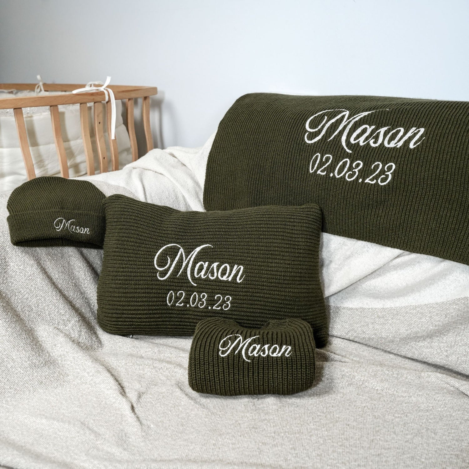 Welcome a new little one with a gift that's as heartwarming as it is adorable: a personalized knitted baby gift set. This charming set includes everything needed to keep baby cozy and stylish: a soft sweater, beanie, blanket, and pillow, each piece lovingly handcrafted with the finest organic cotton.