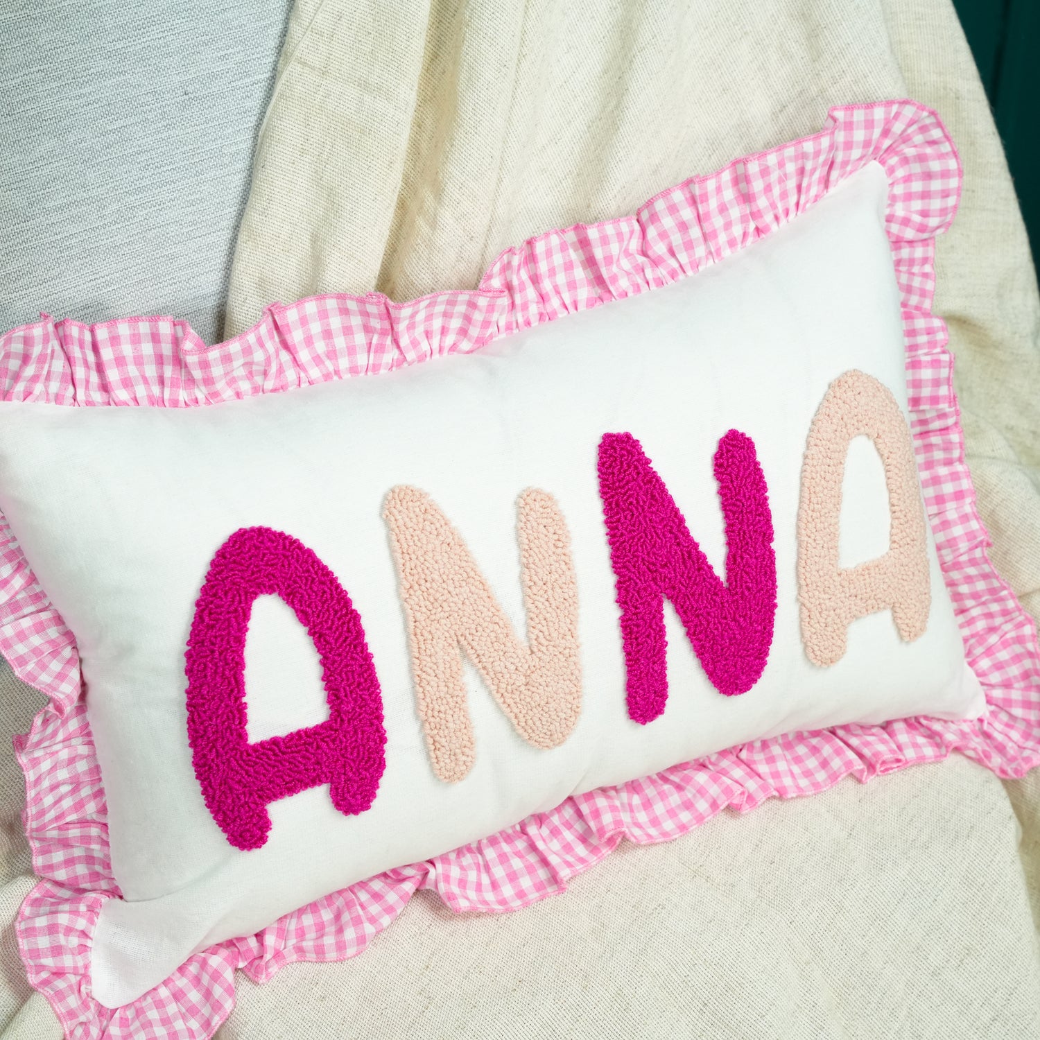 Custom Name Pillow with Punch Needle Embroidery: Gingham Ruffle, Soft – ArriaHome LLC