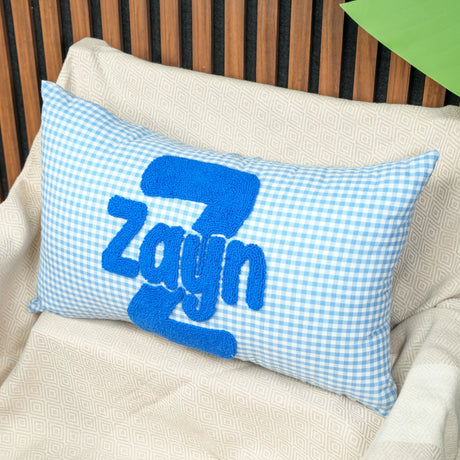 Custom Name Punch Needle Baby Boy Pillow: Blue Gingham Ruffle, College Dorm Decor