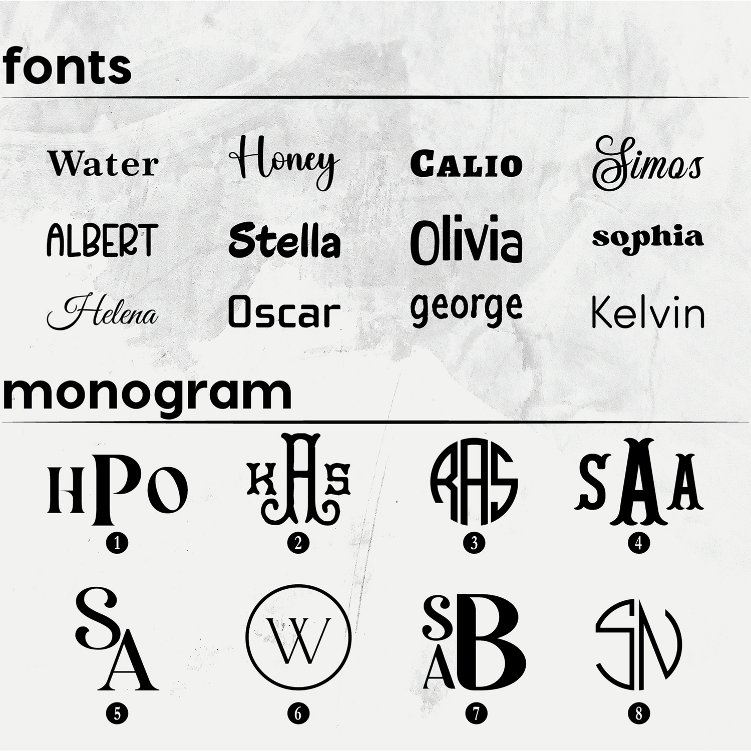 Select from 14 distinct font styles and 8 elegant monogram designs.