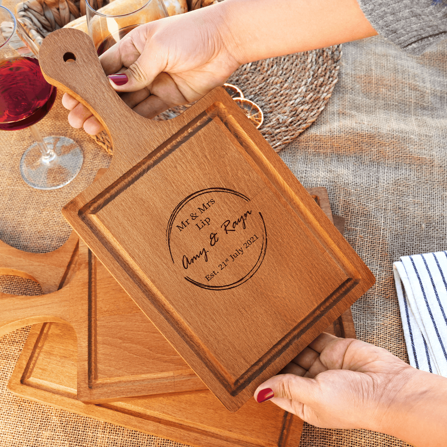 Transform this exceptional wooden serving board with their family name, their new address, a meaningful quote, or even a stylish monogram that reflects their personalities. This thoughtful gift will be a constant reminder of your appreciation and a cherished addition to their home.
