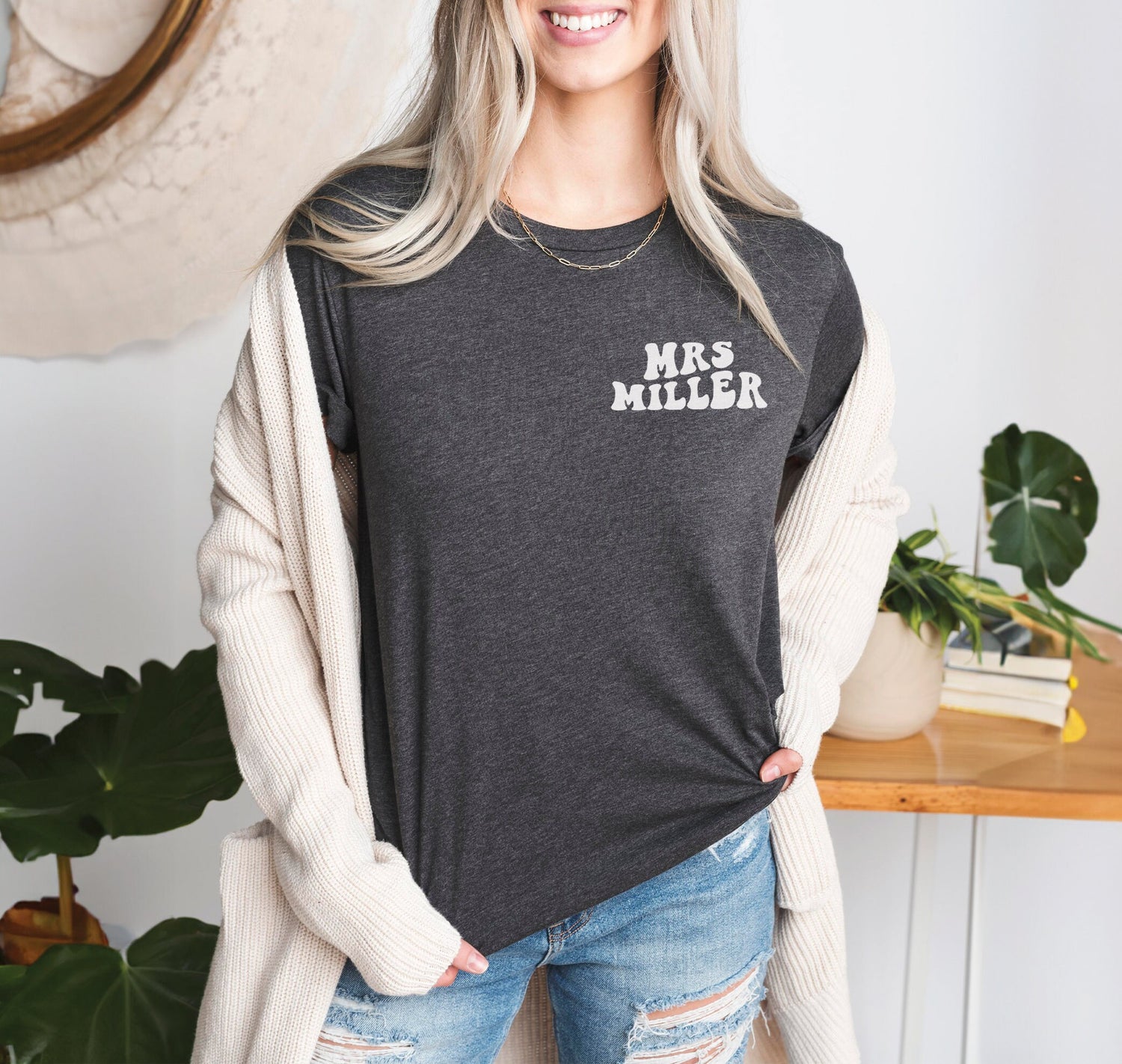 Celebrate her new status as "Mrs." with a personalized shirt! These stylish and thoughtful tees are perfect for wedding gifts, honeymoon attire, bridal showers, or any occasion where you want to acknowledge the newlywed bride.