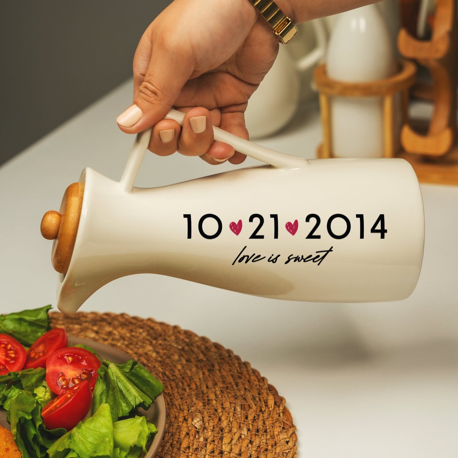 Say goodbye to boring oil and vinegar bottles! Our personalized ceramic oil and vinegar dispenser adds a touch of elegance and functionality to your kitchen. It's more than just a kitchen organizer; it's a unique and thoughtful gift that will be treasured for years to come.