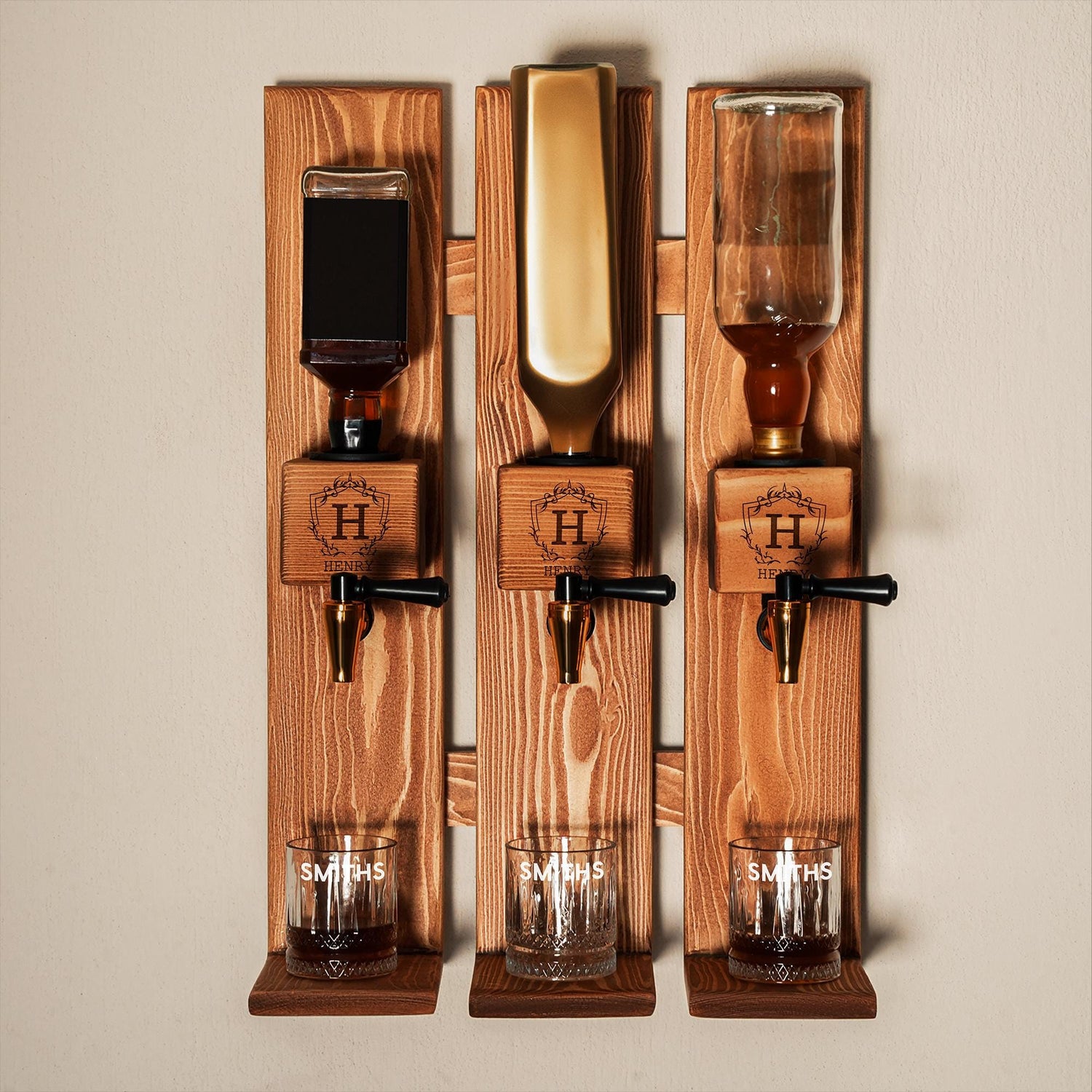 Wooden Whiskey Liquor Decanter with Glass, Man Cave Decor, Custom Groom Gift, Wall Mount Alcohol Dispenser, Personalized Barware for Men