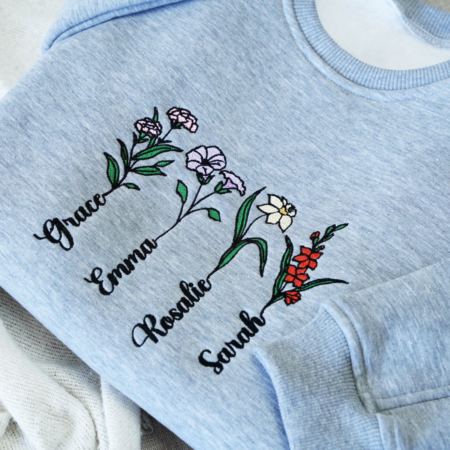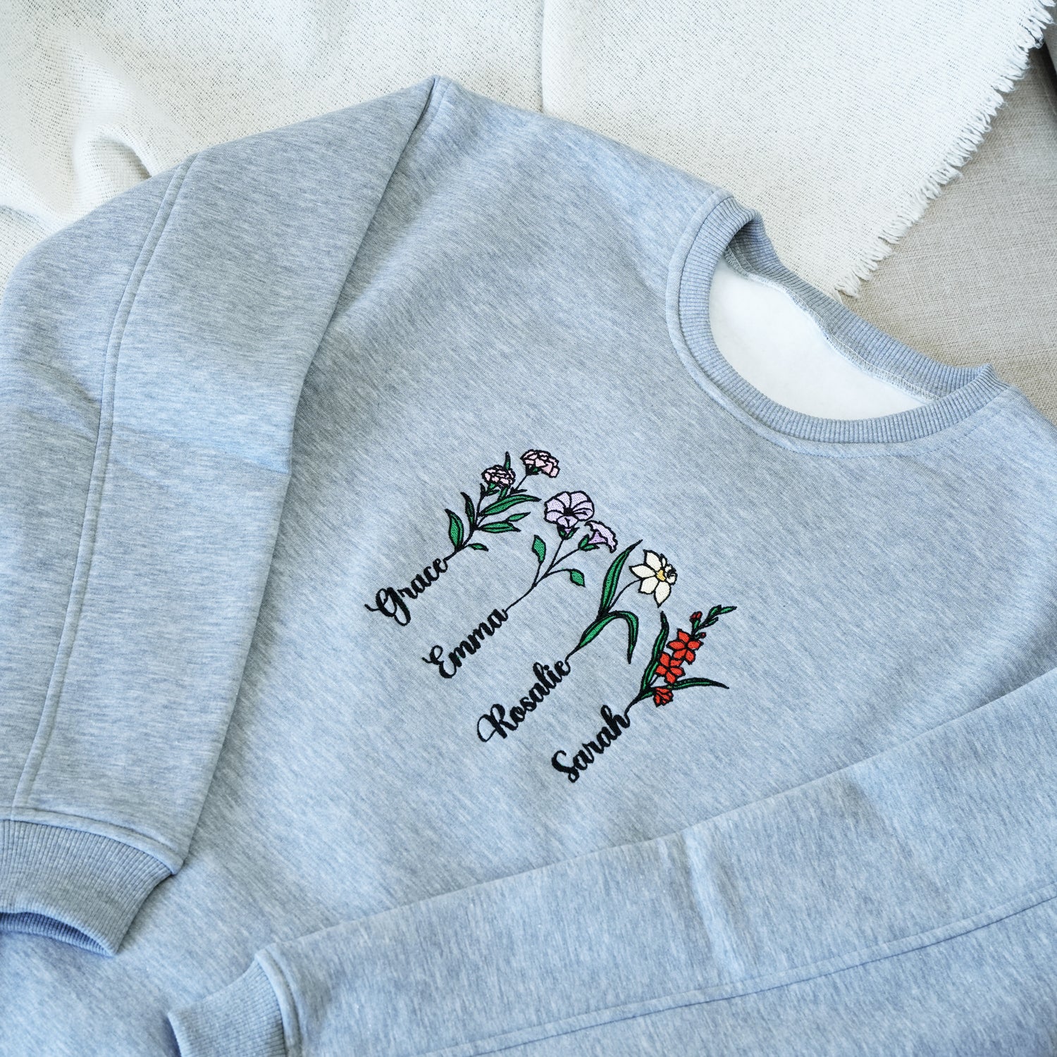 Unique Mother's Day gifts! Personalized hoodies featuring birth flower embroidery. Perfect for Grandmas, Moms, and celebrating family connections. Grandkids' names available.