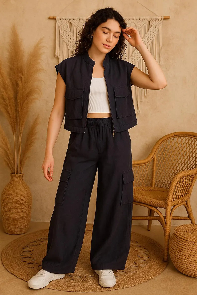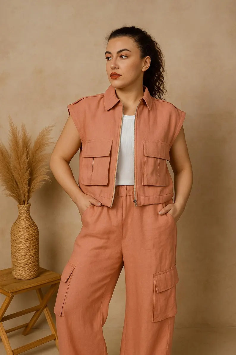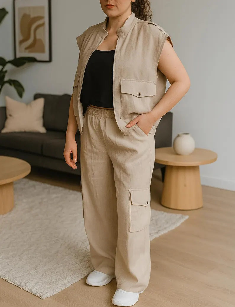 Experience the perfect intersection of modern utility and natural style with our linen cargo vest. This piece is designed to add an effortless edge to your look, whether you're navigating city streets or expressing your creativity. Crafted from breathable, pre-washed linen, it layers beautifully over your everyday essentials. The vest is thoughtfully designed with a sharp zip-front finish, multiple roomy flap pockets, and a subtle elastic hem that adds a touch of shape. It's a stylish, structured, and undeniably practical piece made for a life in motion.
