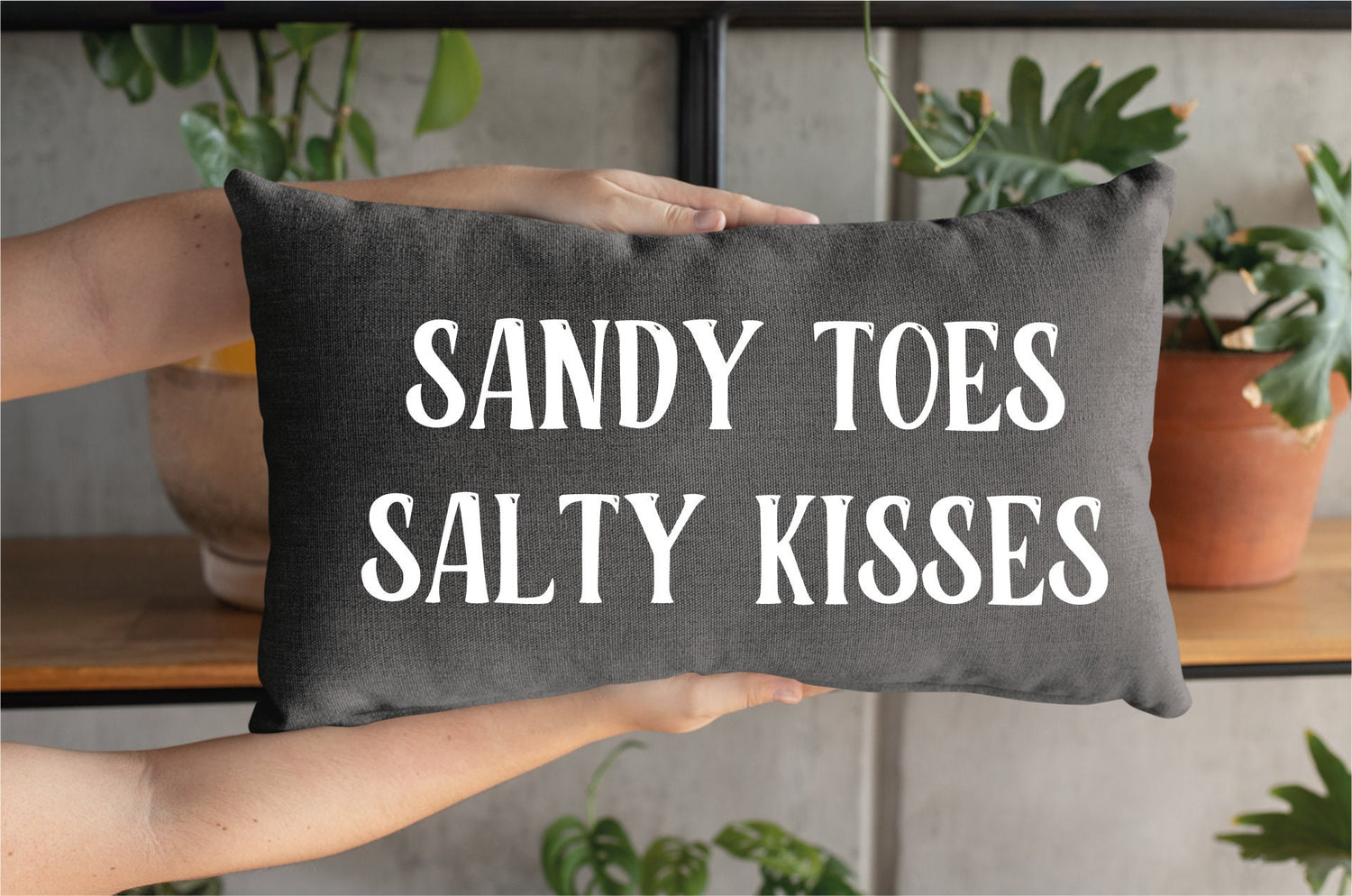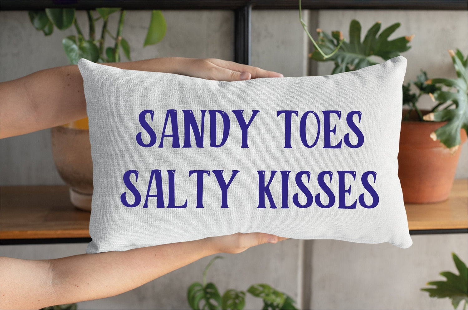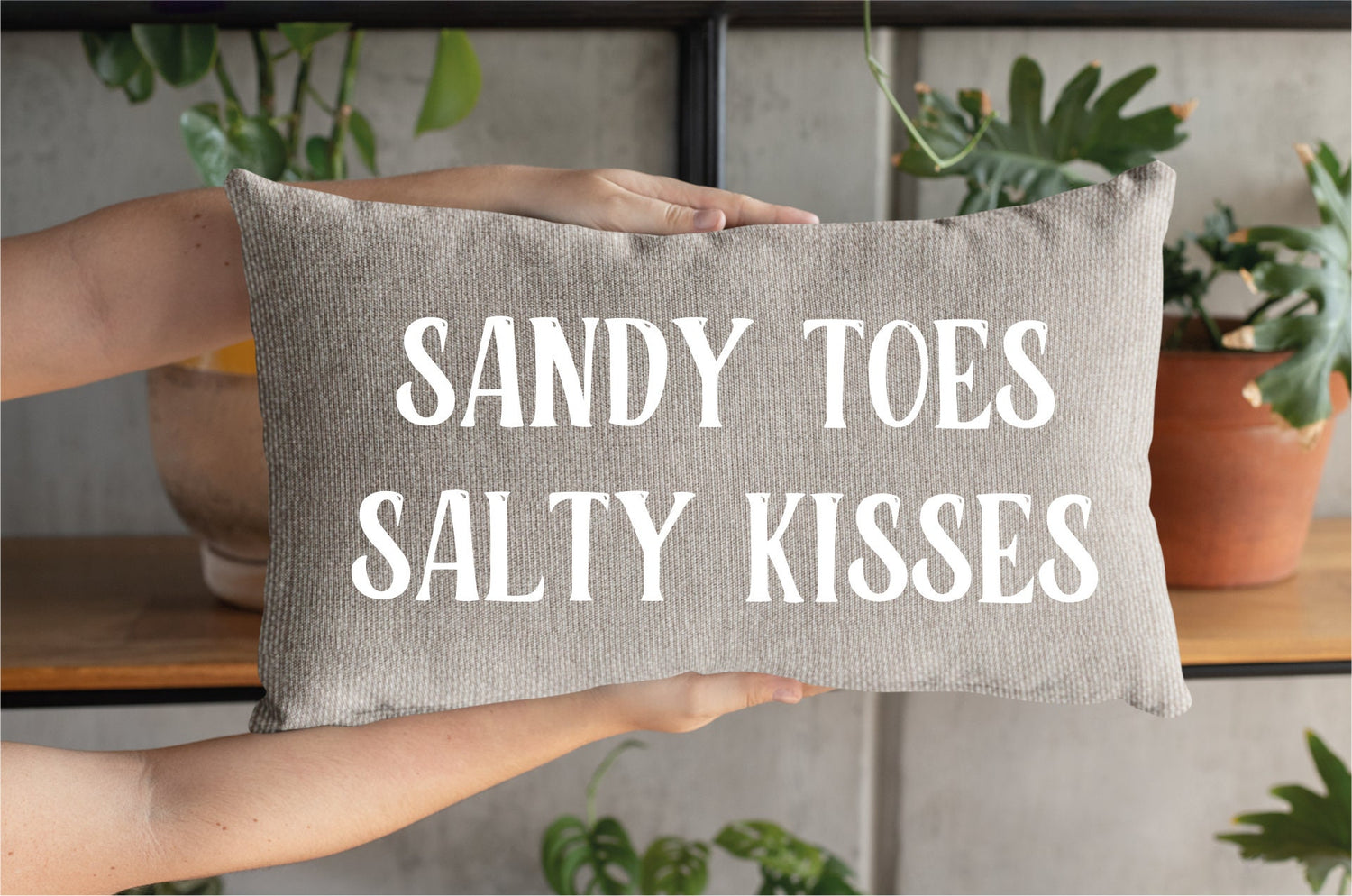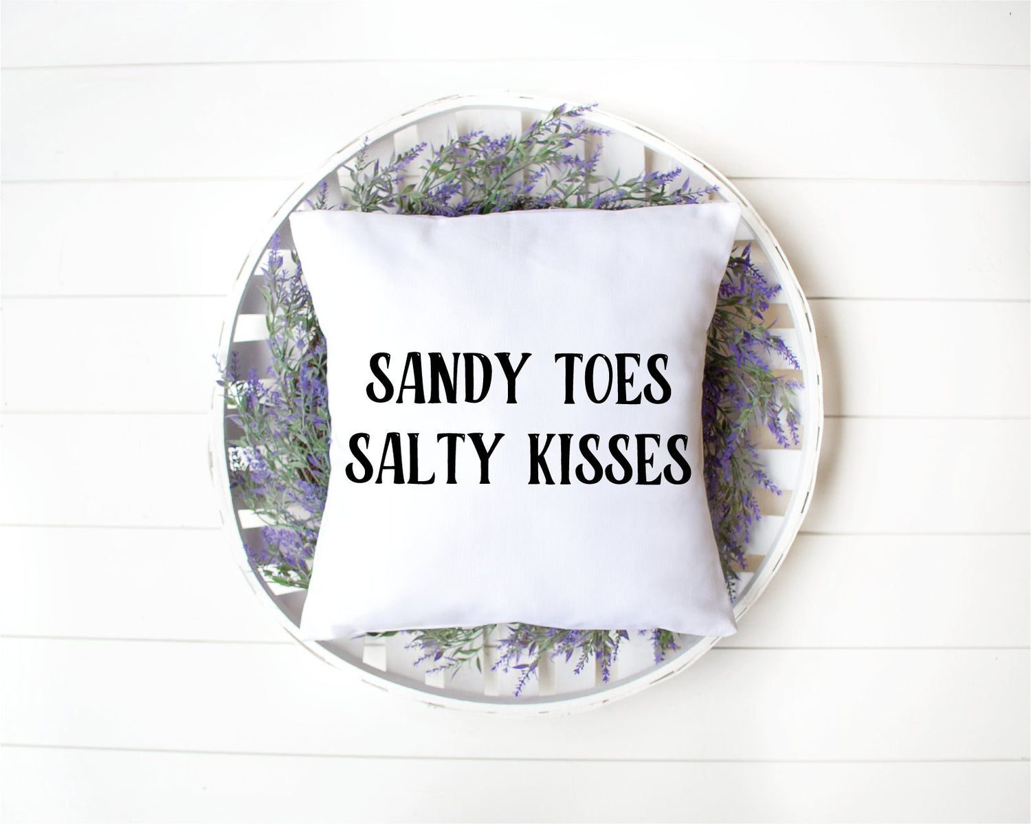 Bring a touch of coastal charm and summer vibes to your home or patio with a personalized "Sandy Toes Salty Kisses" pillow!