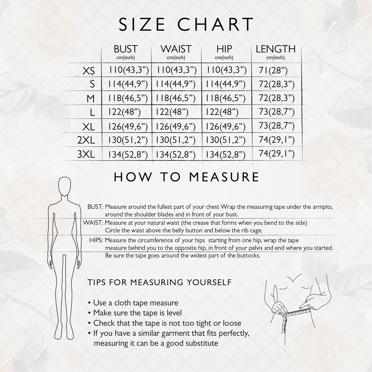 • It is recommended to hang the garment to dry or lay it flat. Do not tumble dry.