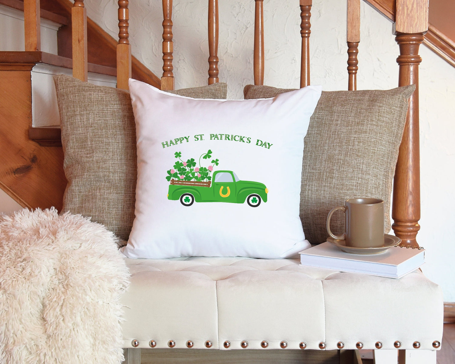 St Patricks Day Clover Track Decorative Pillow, St Patricks Day Decor, Shamrock Truck Pillow, Happy St Patricks Day Gift, Decorative Pillow
