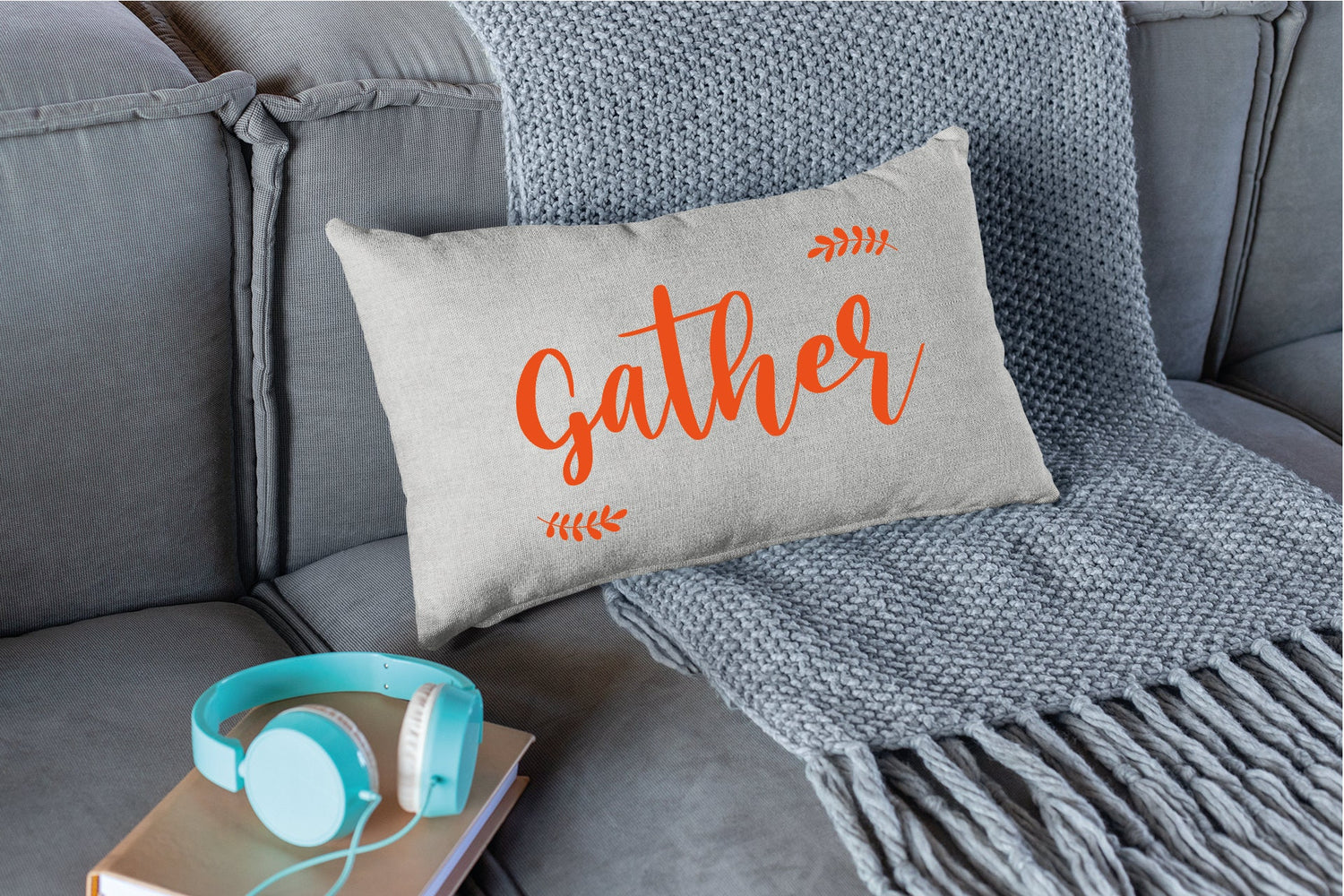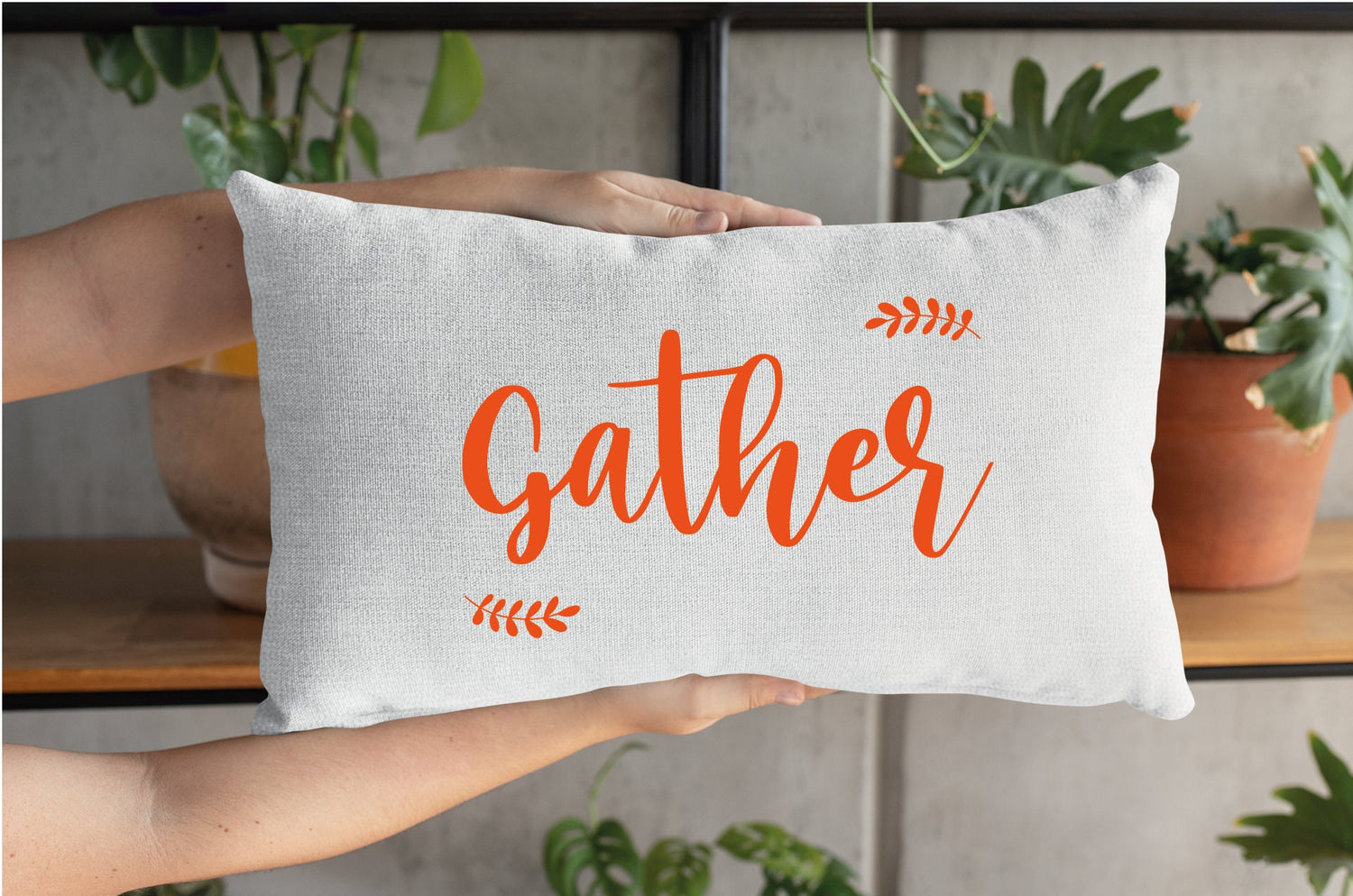 Bring the warmth and beauty of autumn into your home with this charming and customizable "Gather" pillow. Perfect for adding a touch of rustic elegance to your fall décor, it's a welcoming reminder of cozy evenings by the fireplace and the joy of gathering with loved ones.