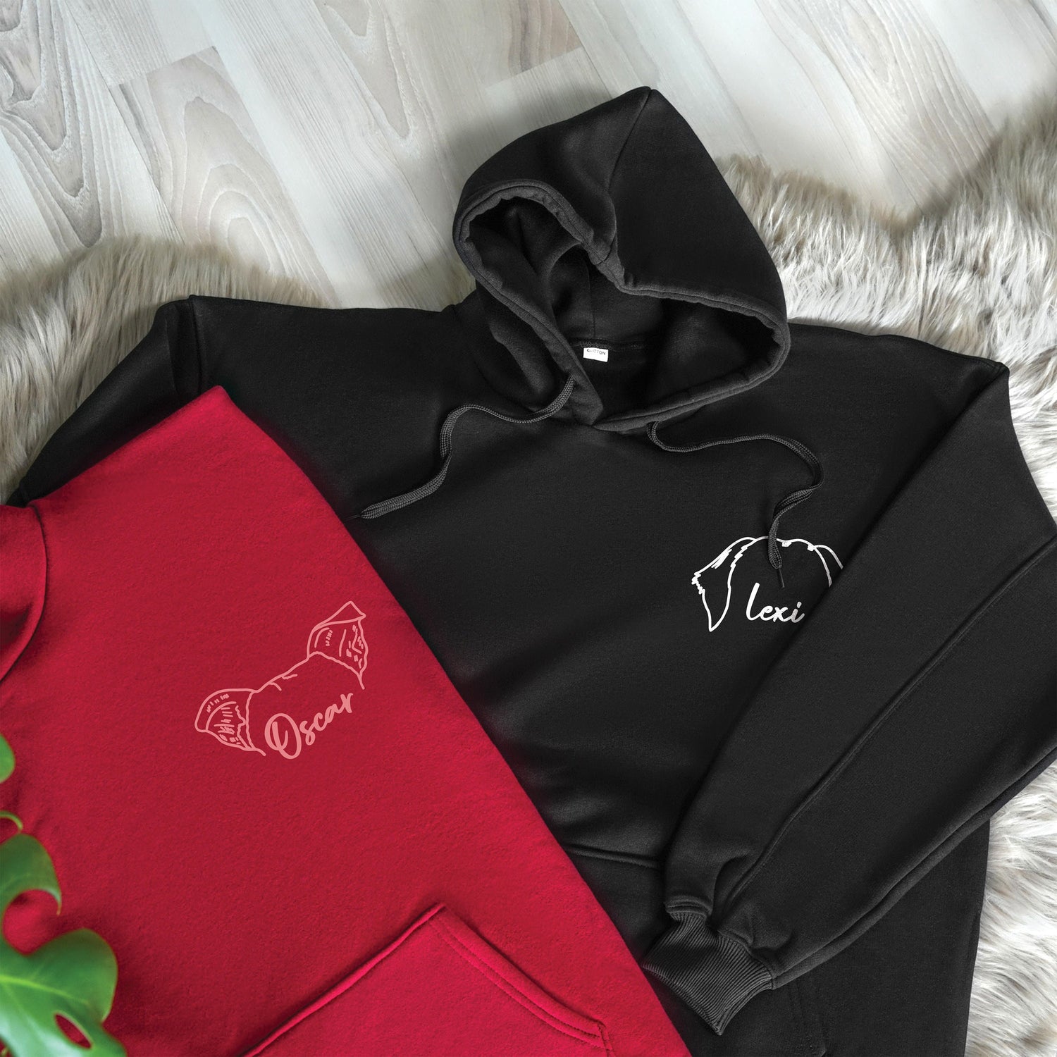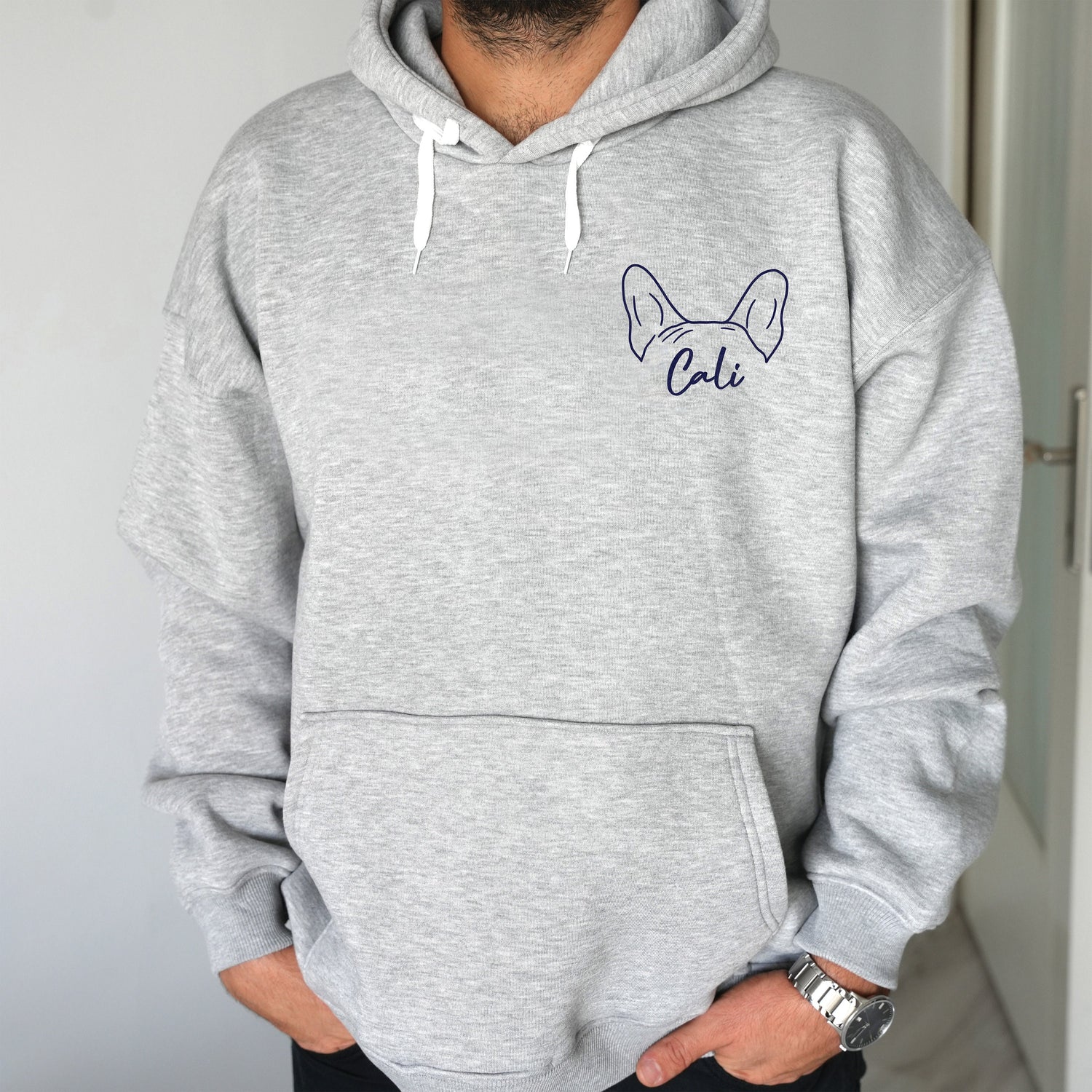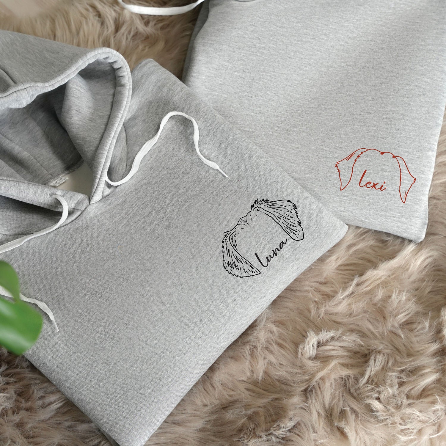 Show your love for your furry companion with this unique, personalized dog hoodie featuring a line art design of your dog's adorable ears. It's the perfect way to express your bond with your pup and make a stylish statement for any dog lover.