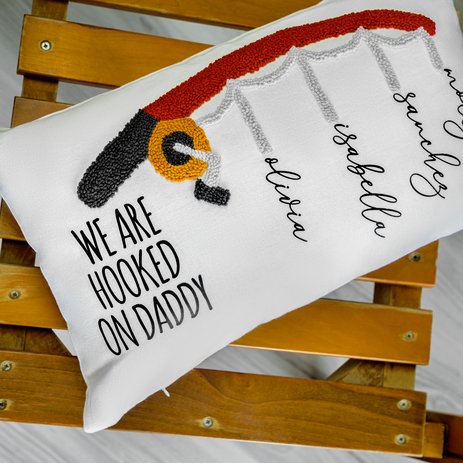 This Father's Day, give Dad a gift that's both heartfelt and hilarious! These handcrafted punch needle pillows feature playful sayings like "We're Hooked on Daddy," "Reserved for Grandpa," or "Dad's Chair, Go Sit Over There," adding a touch of personalized humor to his favorite spot.