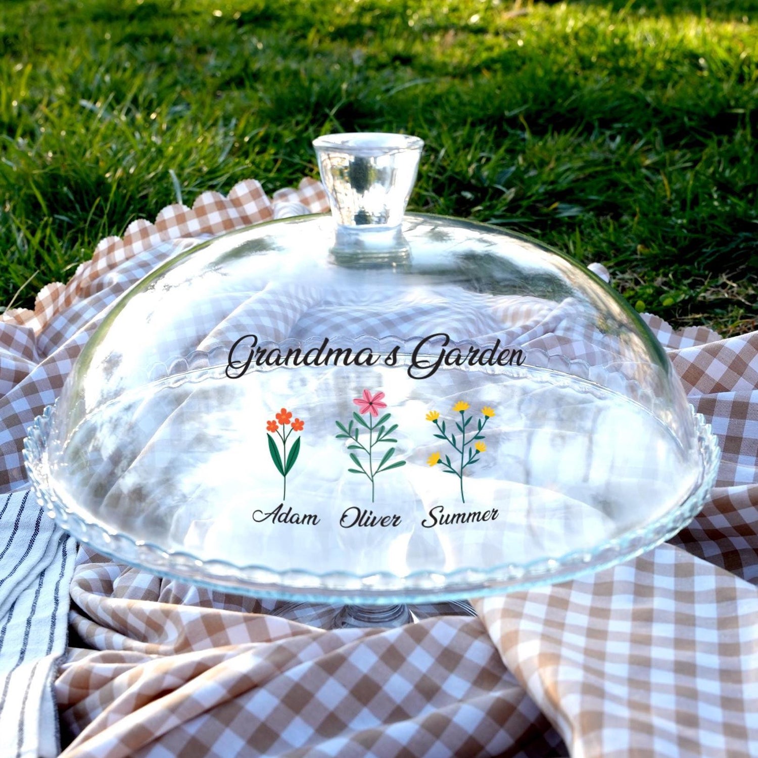 Grandma’s Garden Glass Cake Stand: Personalized Cake Dome, Clear Glass Platter for Family Kitchen