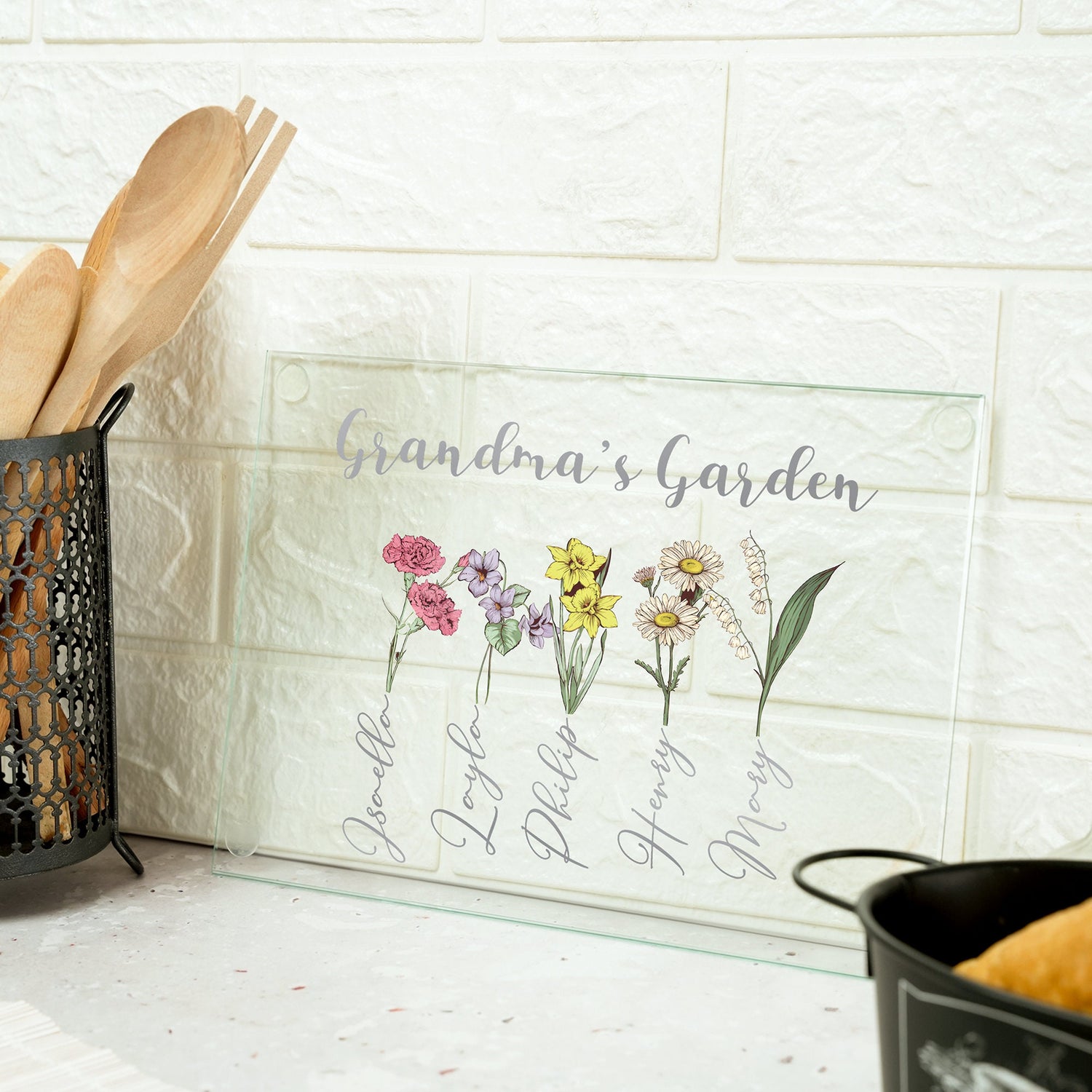 Celebrate the love of a grandmother with a gift as unique and beautiful as her garden! This custom "Grandma's Garden" glass cutting board is a thoughtful keepsake she'll cherish, blooming with personalized touches that warm her heart.