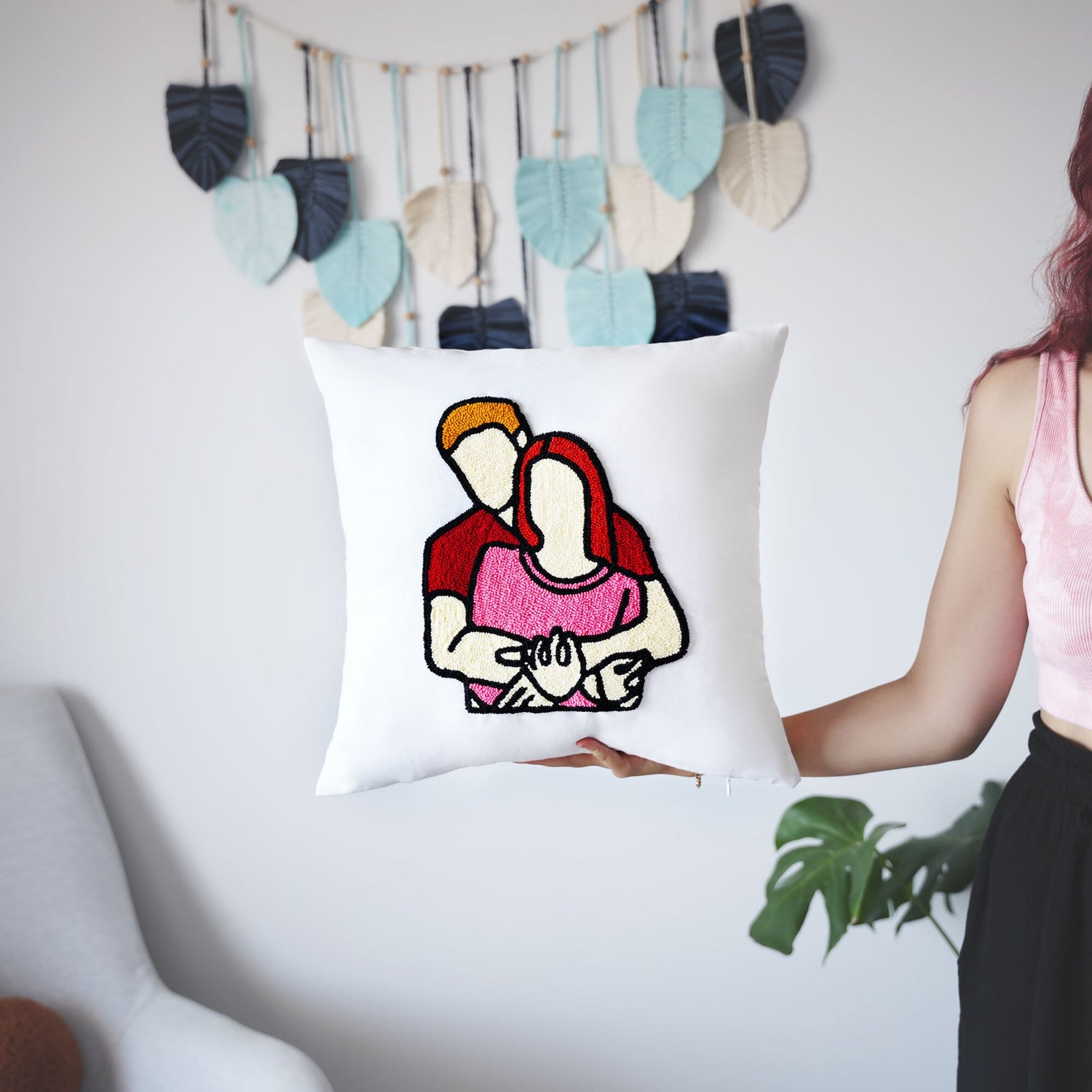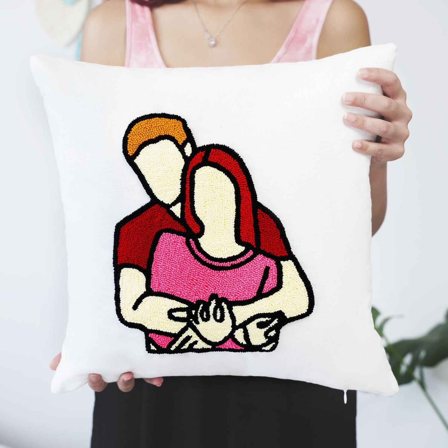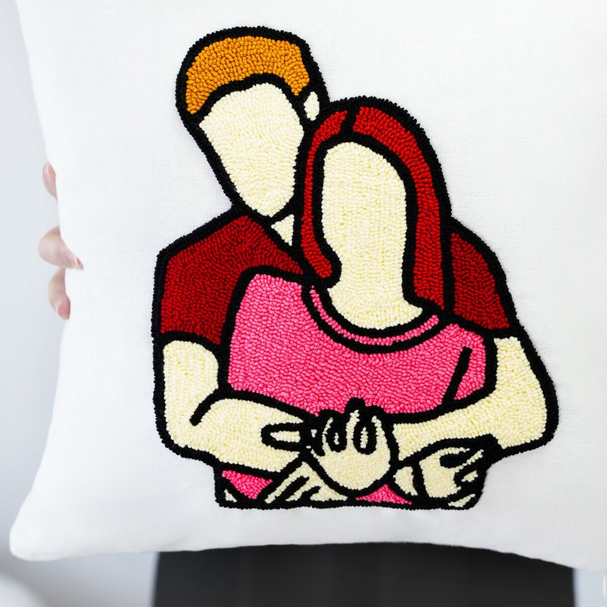 This heartwarming and personalized lumbar pillow is a beautiful way to celebrate a special relationship. It features a custom-designed, faceless couple portrait embroidered with meticulous punch needle artistry. This unique design captures the essence of the couple without revealing their faces, making it a truly unique and special gift.