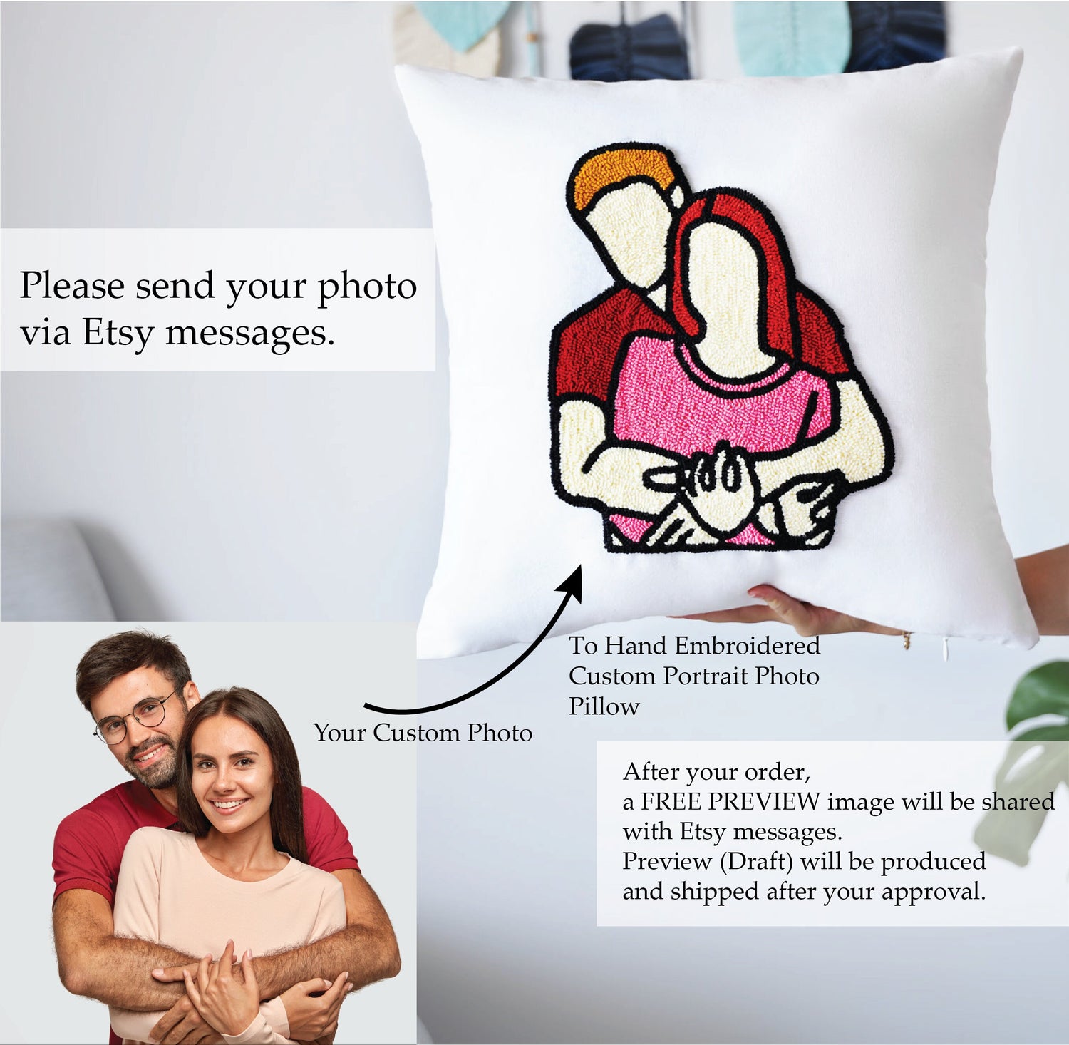 Custom Faceless Couple Portrait from Photo Embroidered Pillow, Anniversary Wedding Gift, Gift for Him, Girlfriend Gift, Custom Drawing Gift