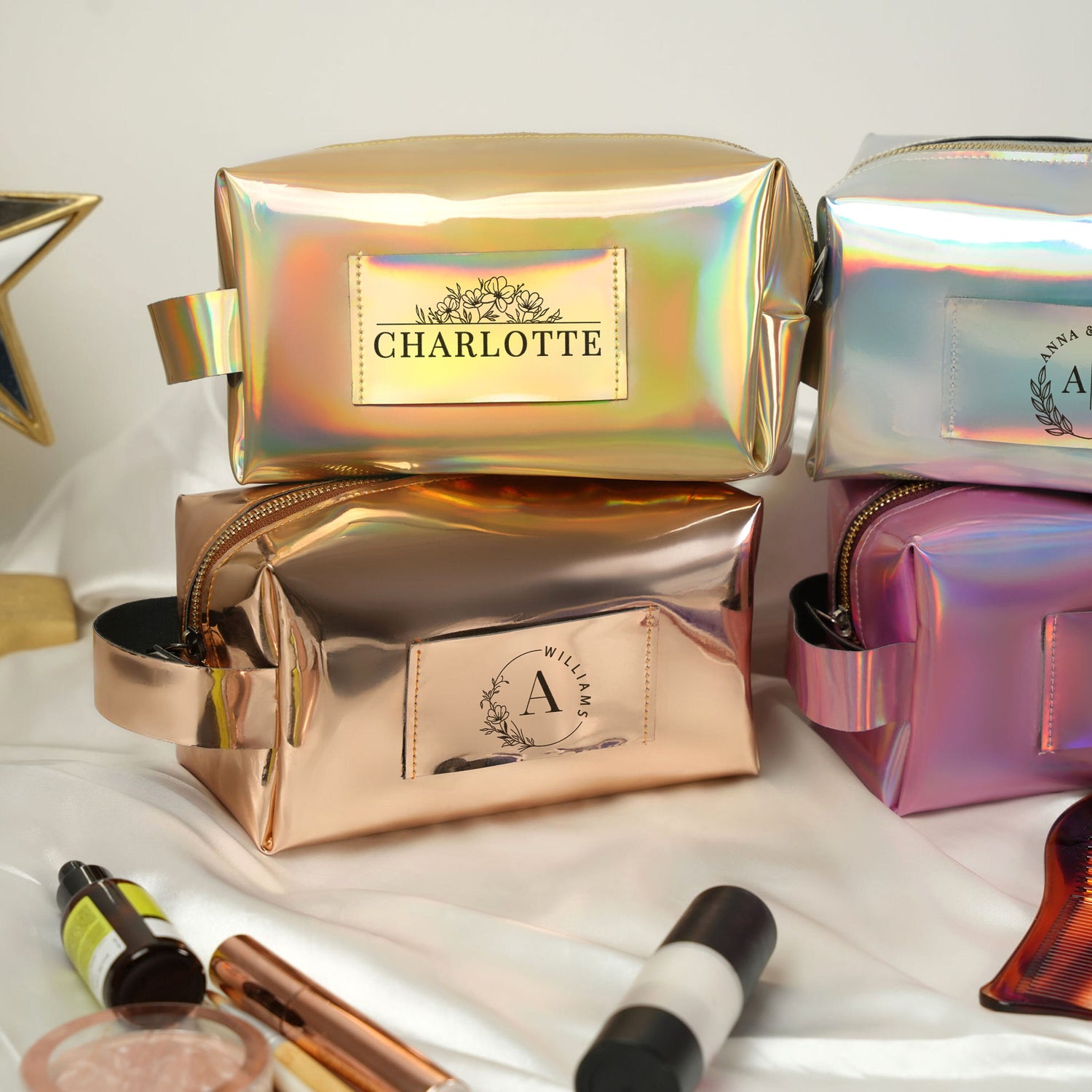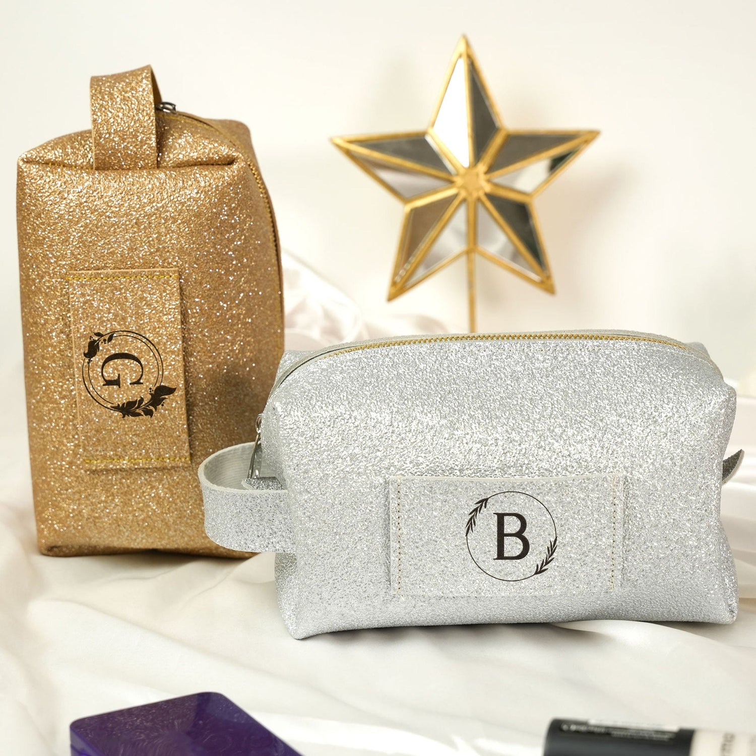 Gold Glitter Custom Leather Makeup Bag, Women Toiletry Bag, Bridesmaid Proposal Gift, Personalized Clutch, Gift for Her, Cosmetic Bag Pouch