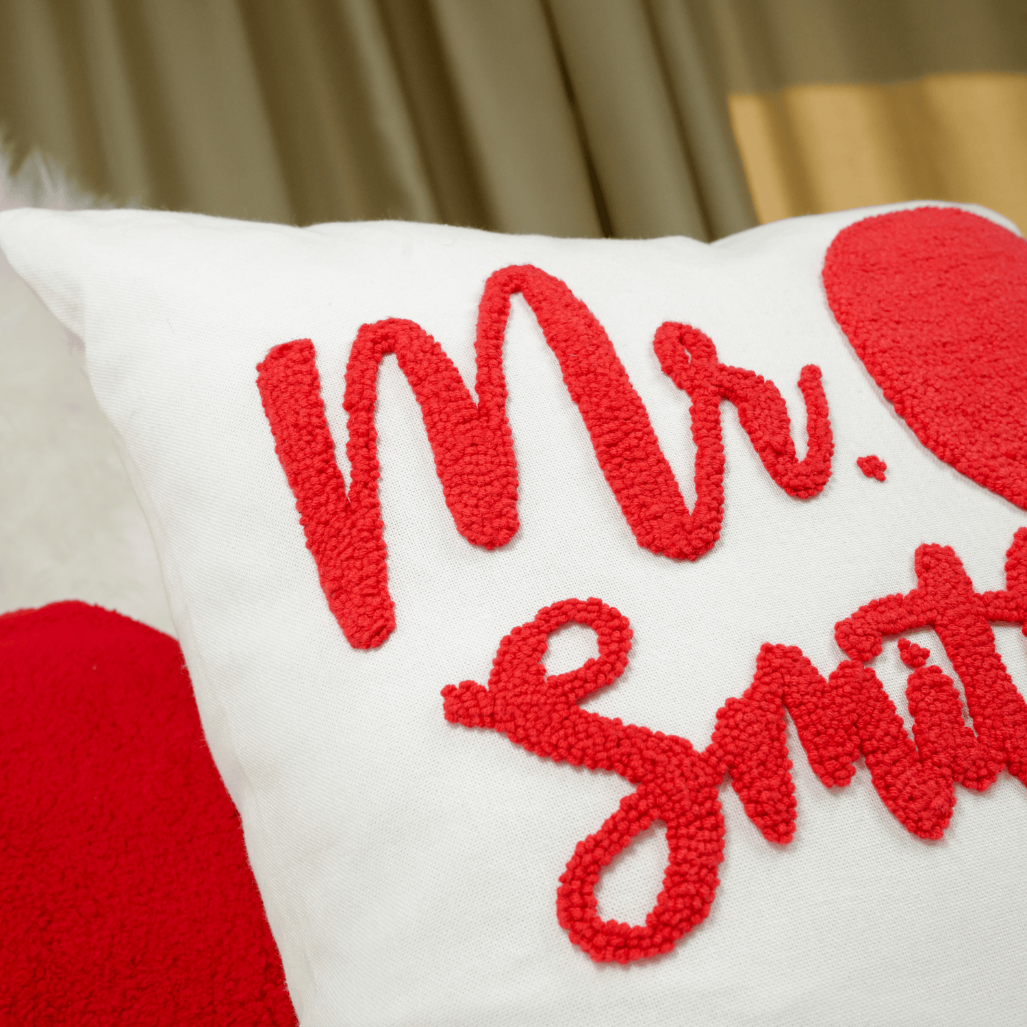 Celebrate a wedding, anniversary, Valentine's Day, or any special occasion with this heartwarming "Mr & Mrs" pillow. Featuring the couple's last name beautifully embroidered with a delicate heart, this handcrafted pillow is a thoughtful and lasting gift for a loved one.