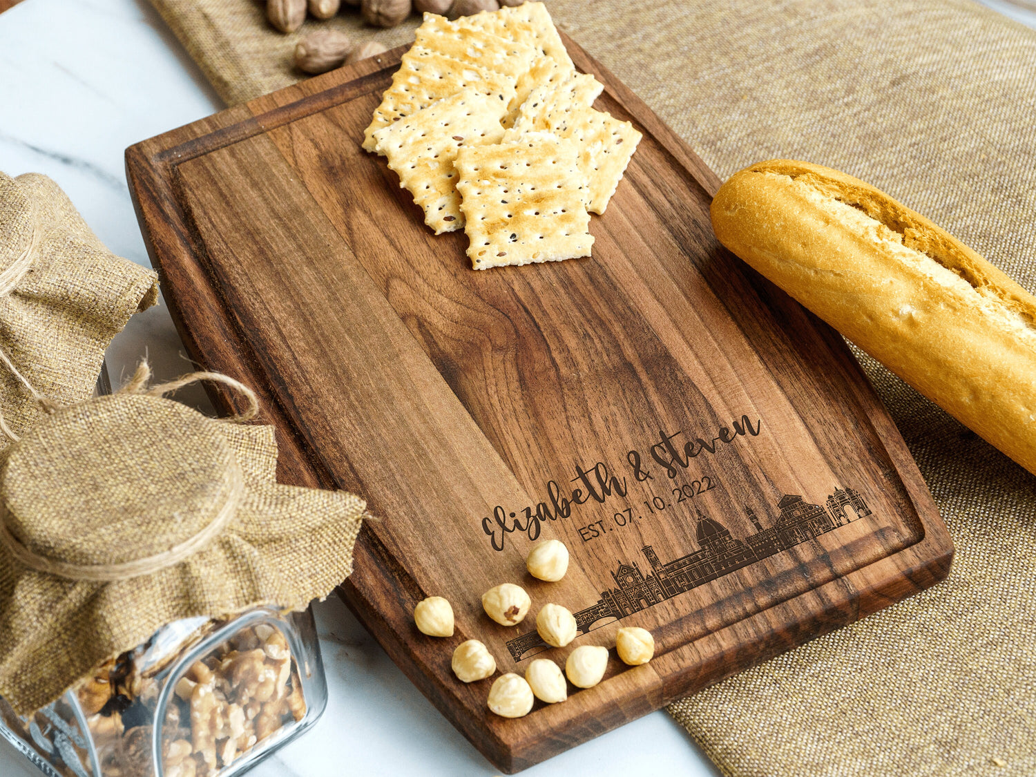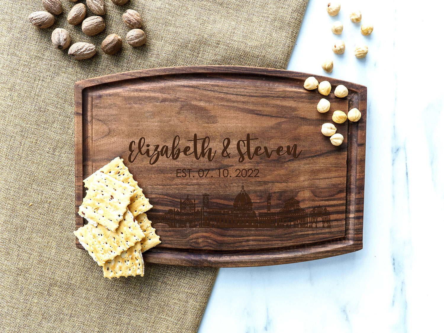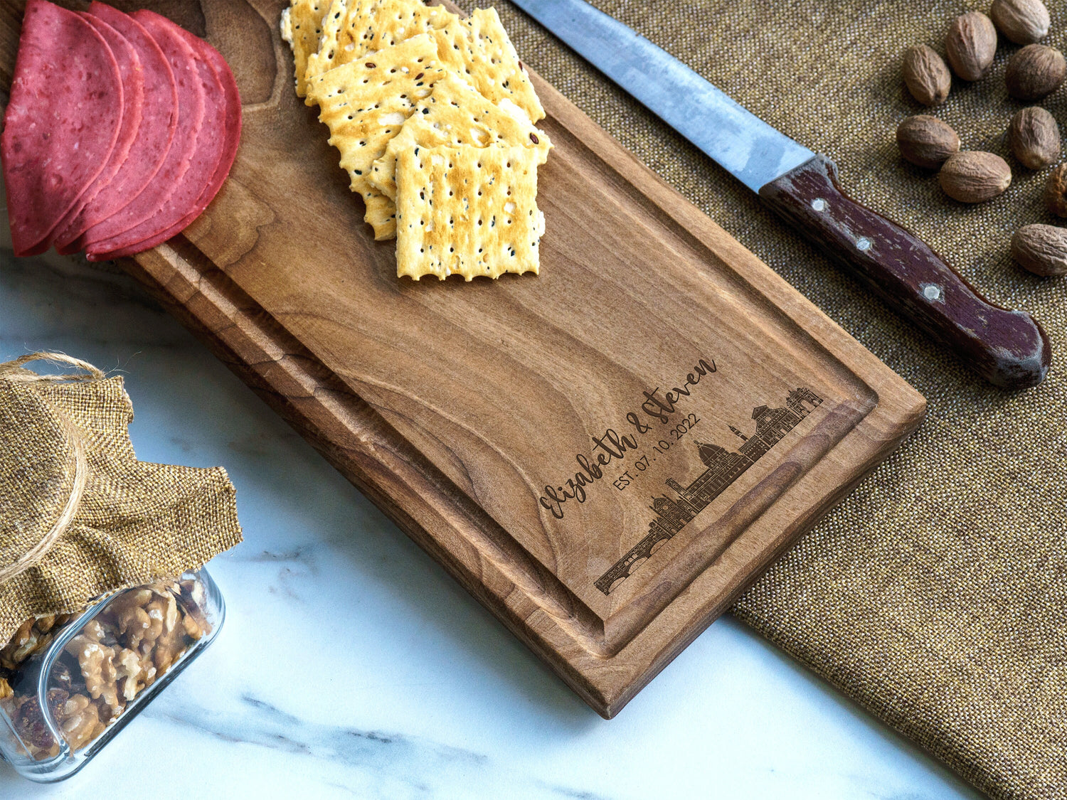 Personalized City Skyline Board, Engraved Cutting Board, Wedding Gift, Newly Wed Gift, Personalized Charcuterie Board, Cheese Board, Gift is backordered and will ship as soon as it is back in stock.