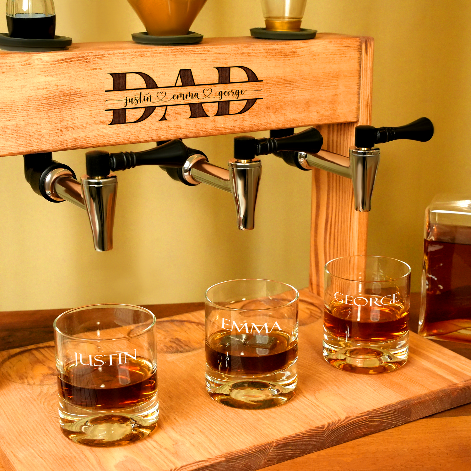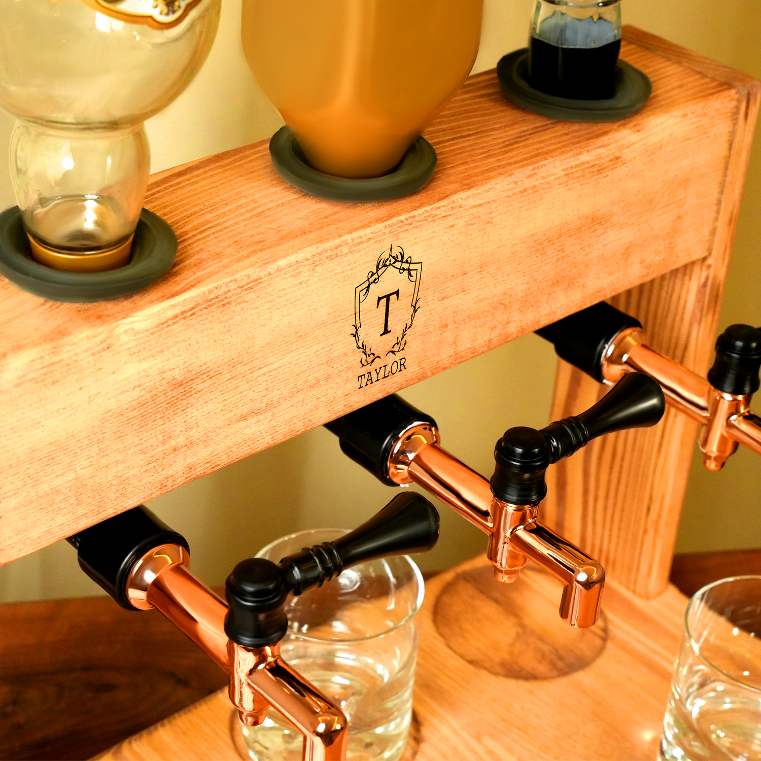 The Complete Whiskey Experience: This set combines the rustic charm of a liquor dispenser with the refined elegance of a whiskey decanter (sold separately) and personalized bourbon glasses.