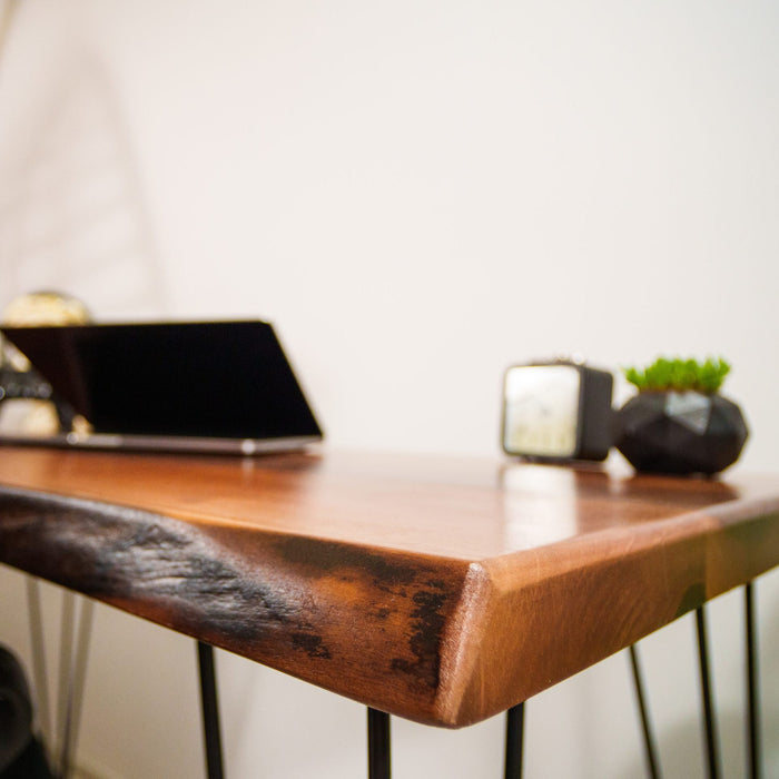 Just as you enter the kitchen to prepare a coffee, there's a knock on the door and the courier is standing at your door with a huge Arria Home box. He carried your package to your room. You opened it out of curiosity. It's from your children. Oh my God! They sent one of those live edge desks you've always wanted, the one you've planned to put in your workroom. The glossy surface, the naturalness of the wood, the imperfections of the edges, the elegant two pairs of legs. You want to thank first your children and then Arria Home—the perfect motivation to start that book you've always wanted to write. The color is in perfect harmony with your newly decorated room. It is a unique piece that you find peace every time you look at it.