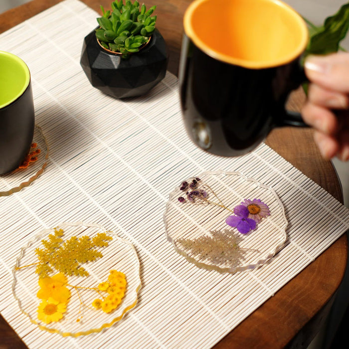 For a table adorned with fresh flowers, consider our resin coasters. These stunning epoxy coasters, adorned with dried natural flowers in vibrant hues, will add a touch of nature's beauty to your table setting. Complement your carefully prepared dishes with our resin cutting board, featuring a wave-like epoxy design reminiscent of the sea.