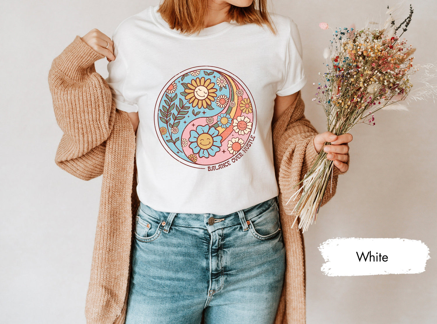 Find harmony in your everyday life with a personalized "Balance Over Hustle" Ying Yang Flower tee! This beautifully designed shirt celebrates the power of finding balance and living with intention.