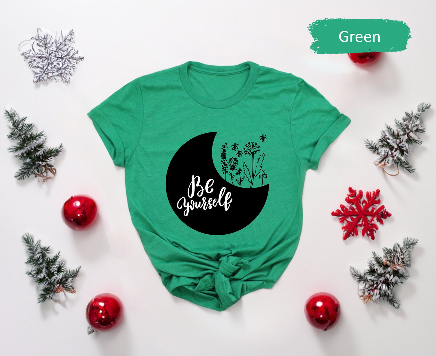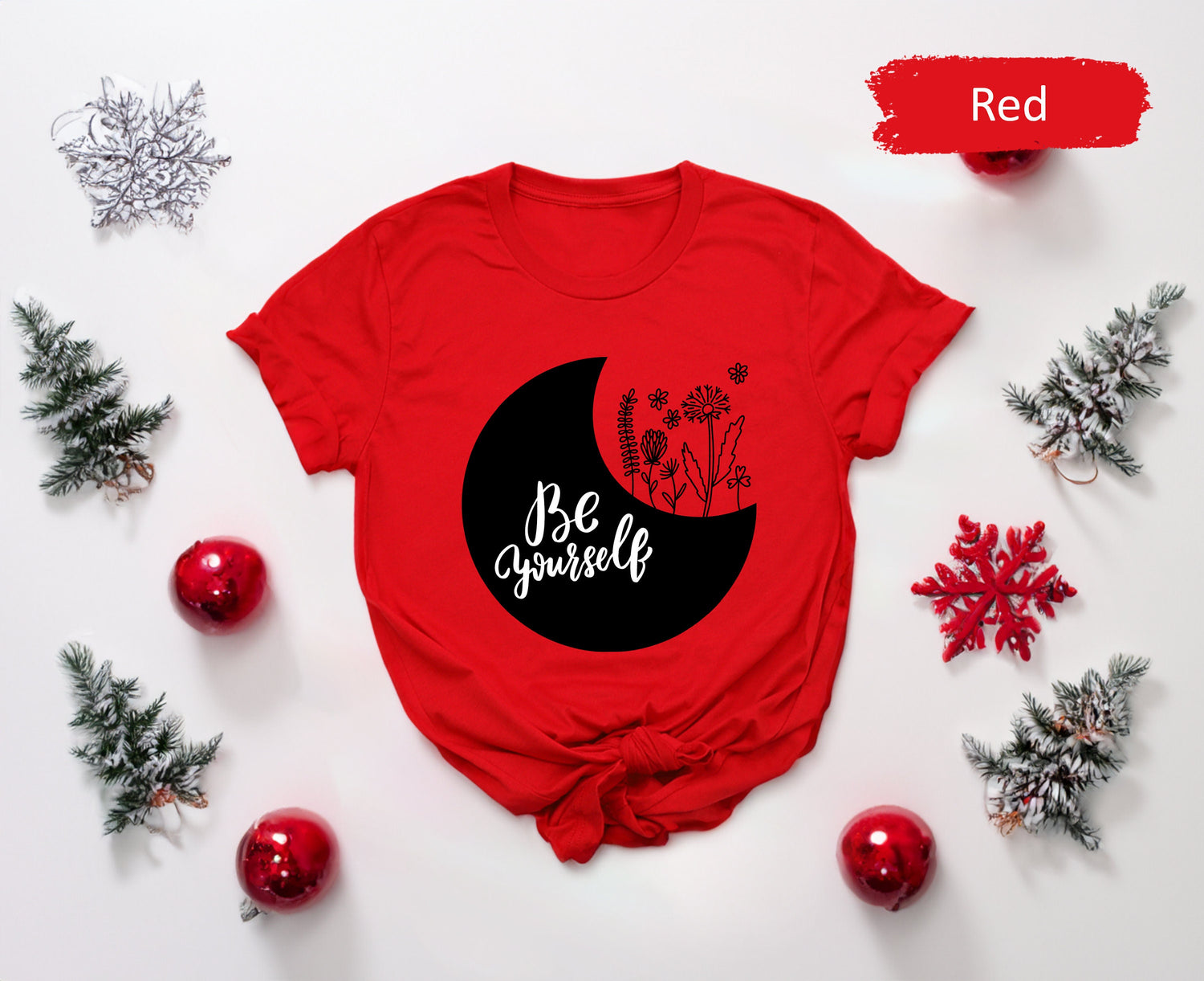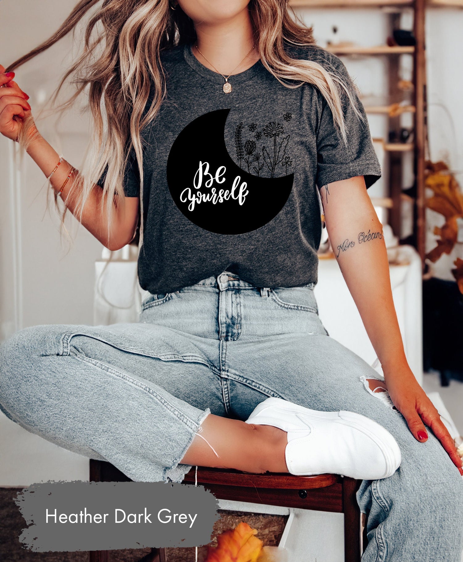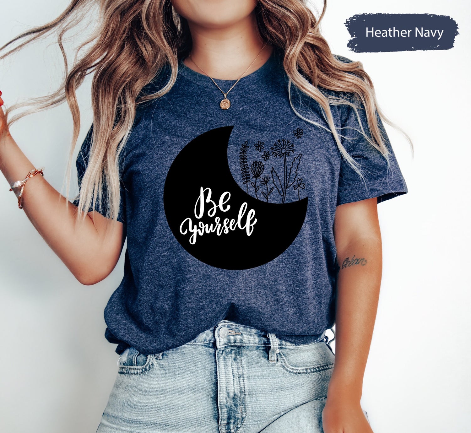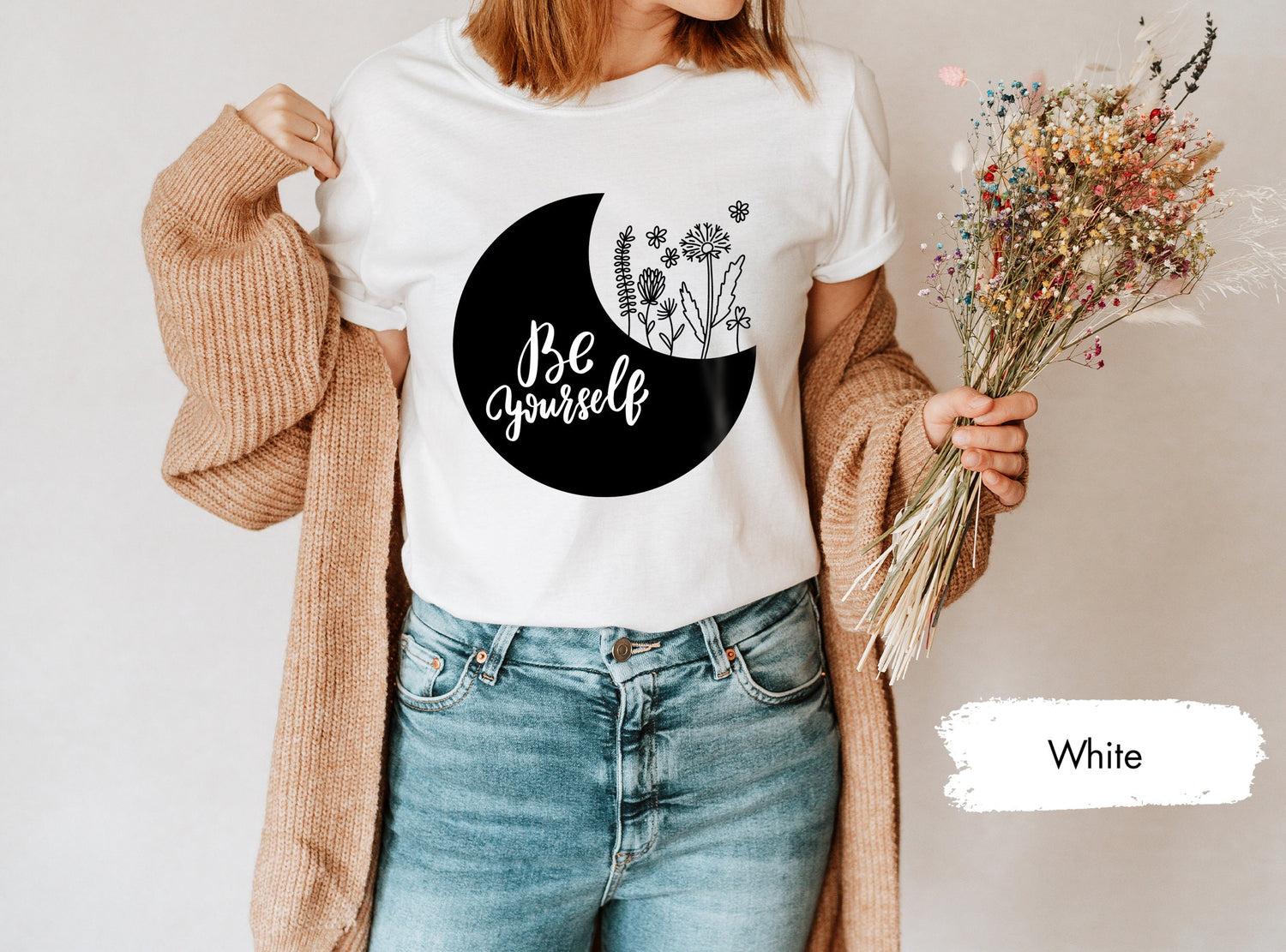 Embrace your unique spirit with this enchanting "Be Yourself" tee featuring a beautiful floral moon design! This tee combines the beauty of nature with a powerful message of self-acceptance and individuality, making it a perfect choice for those who want to express their inner strength and creativity.