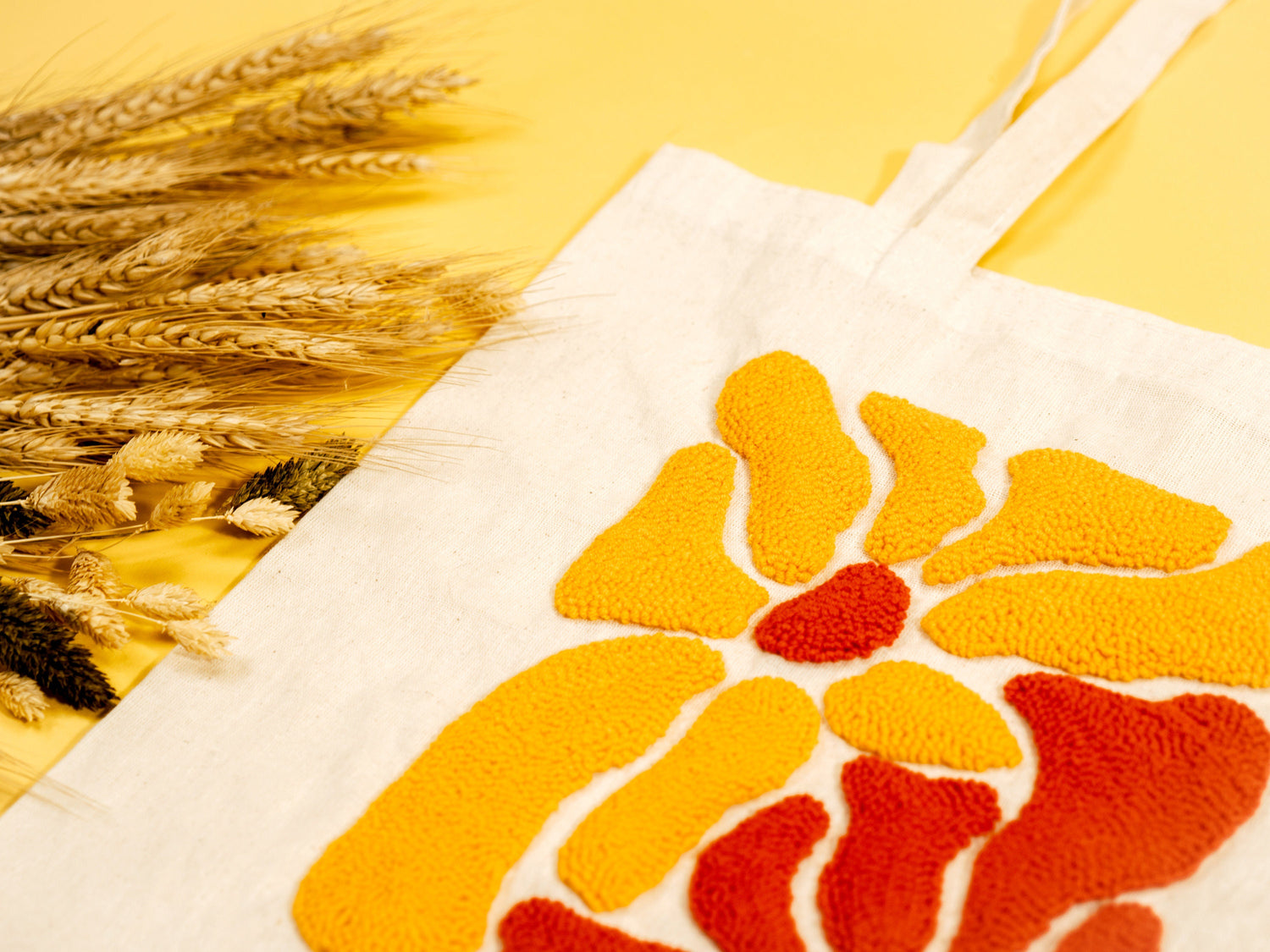 Make a statement with this eye-catching tote bag featuring original punch needle embroidery. This eco-conscious and stylish bag is perfect for everyday use, from running errands to carrying books, art supplies, or your latest creative project.